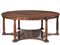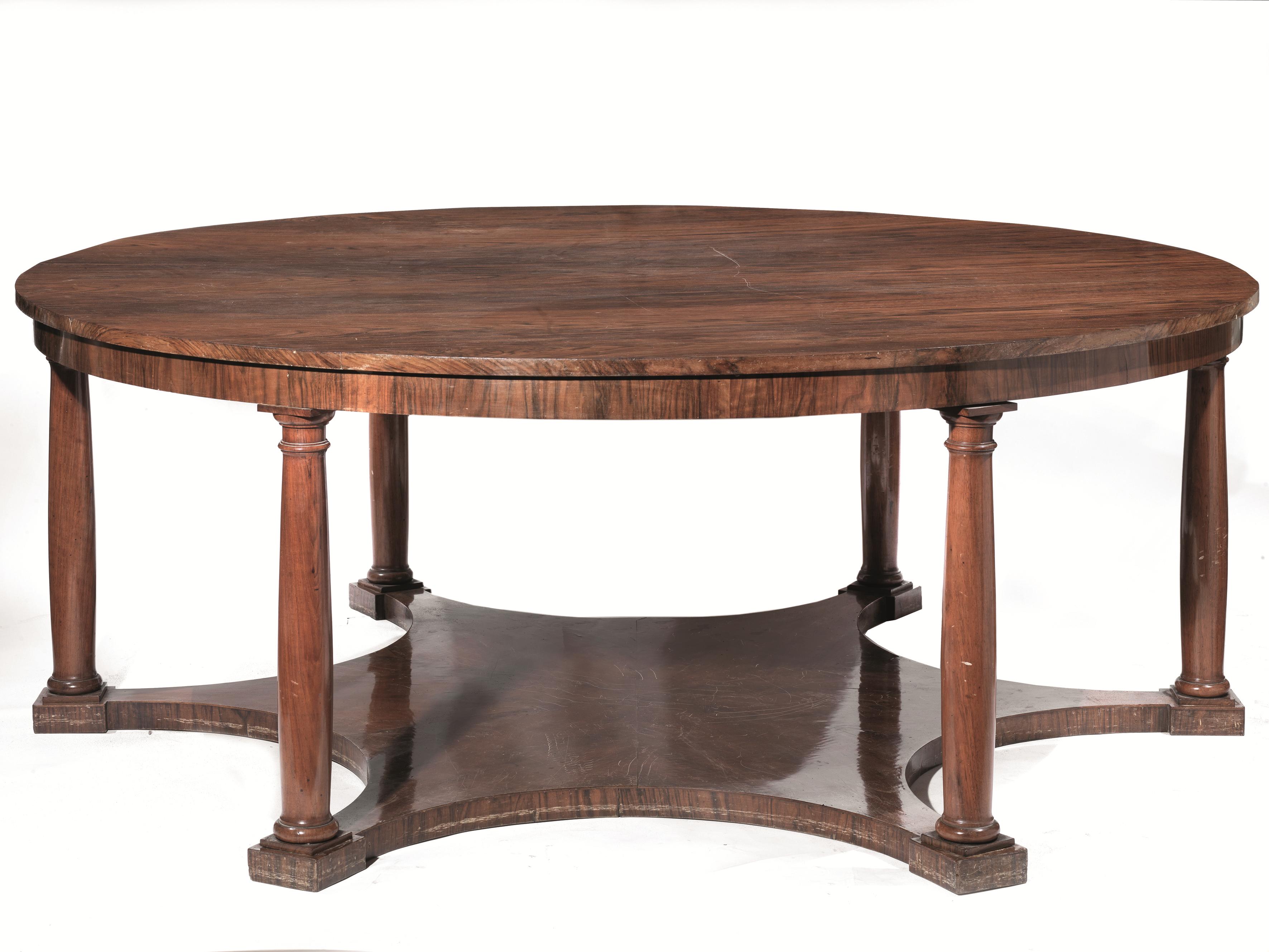 in radica di noce, piano circolare sostenuto da sei colonne tuscaniche poggianti su una base sagomata, diam. cm 200, alt. cm 80, piccoli danni