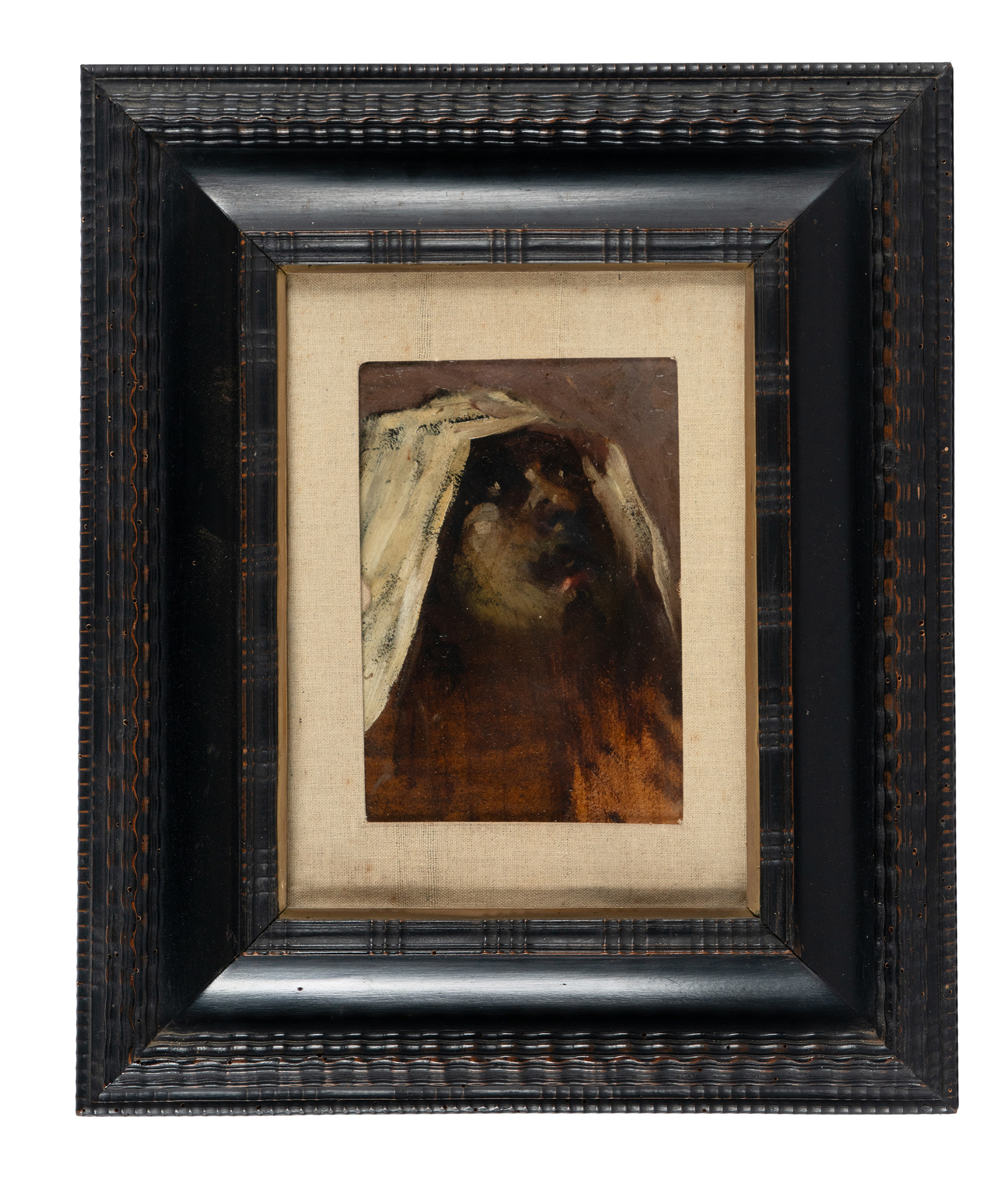Olio su cartone. cm 25x18. Iscrizione a matita sul verso: "Ugo Valeri, Piove di Sacco / Venduto dal sottoscritto al Cav. [...] / Toschi per £ 10 nel 1906 / Amleto Montevecchi". (1) In spessa cornice con vetro: cm 55x45,5. Cartone brunito con difetti ai margini e spellamenti al verso. Buona conservazione.