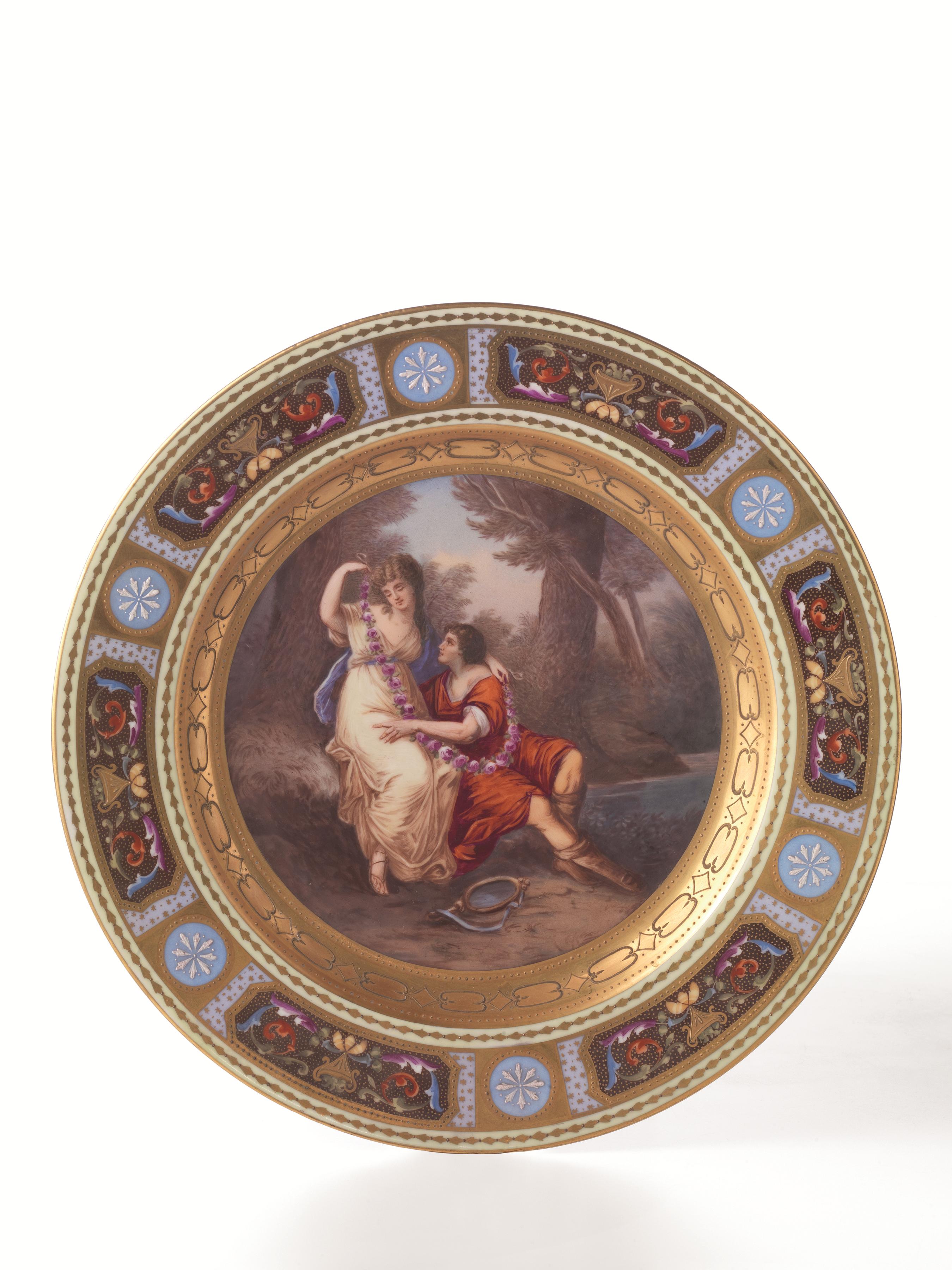 porcellana dipinta in policromia e oro, raffigurante Rinaldo e Armida. Tesa a fondo dorato riccamente decorata in policromia a motivi vegetali entro riserve sagomate intervallate a medaglioni circolari. Cavetto incorniciato da ampia fascia in oro con incisioni e puntinature a rilievo e decorato da ampia scena derivante dalla Gerusalemme Liberata.