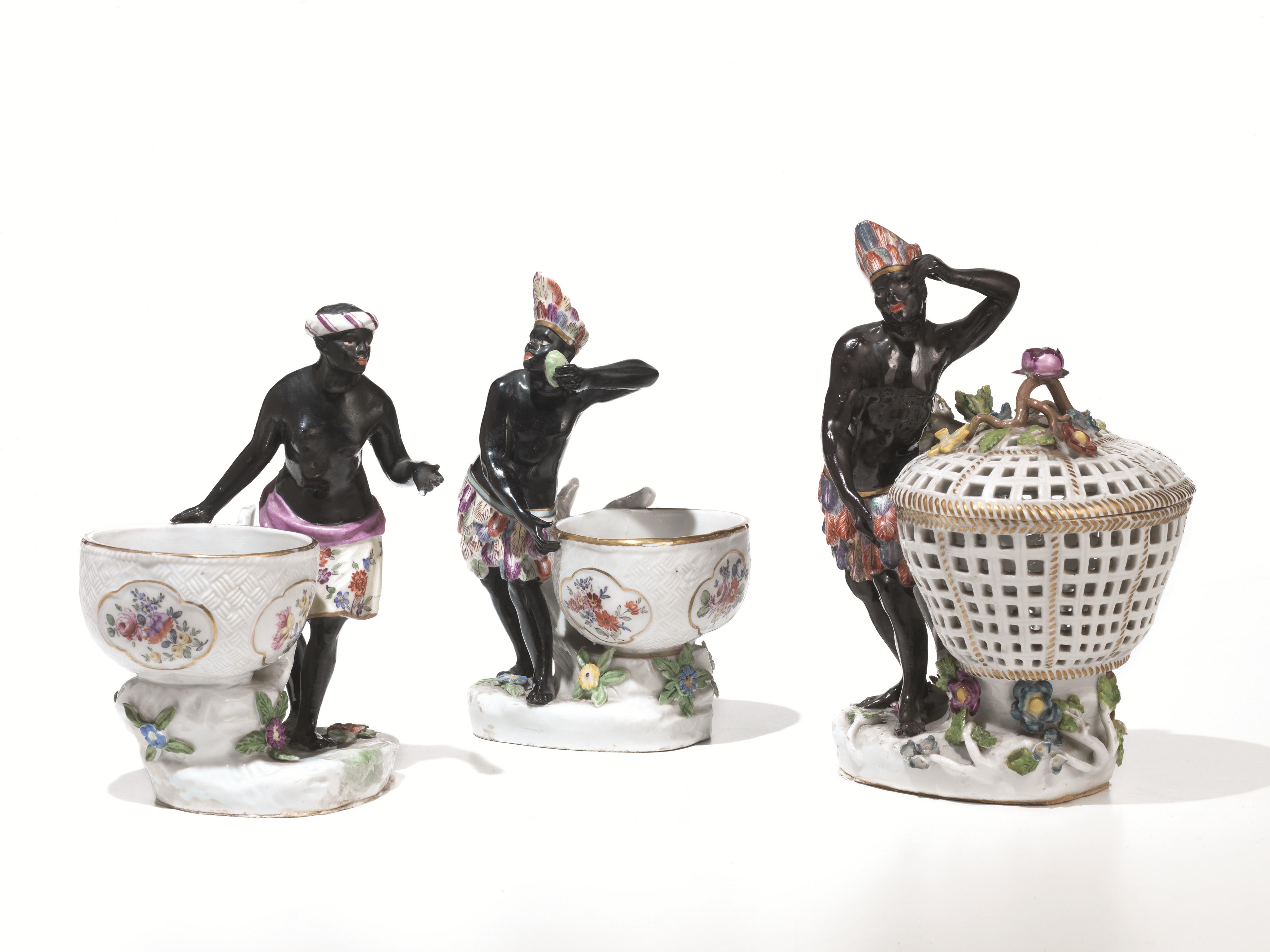 porcellana decorata in policromia e oro, modellata a raffigurare tre mori appoggiati ad un tronco nell'atto di sorreggere dei cesti. Il gruppo centrale, caratterizzato da un moro di dimensioni maggiori e dal tronco completo di foglie, presenta un cesto di forma ovale interamente traforato e profilato in oro completo di coperchio con presa a ramo fiorito a rilievo, mentre i contenitori sorretti dalle figure laterali, anch'essi di forma ovale, sono decorati da tre riserve sagomate centrate da mazzi di fiori policromi.