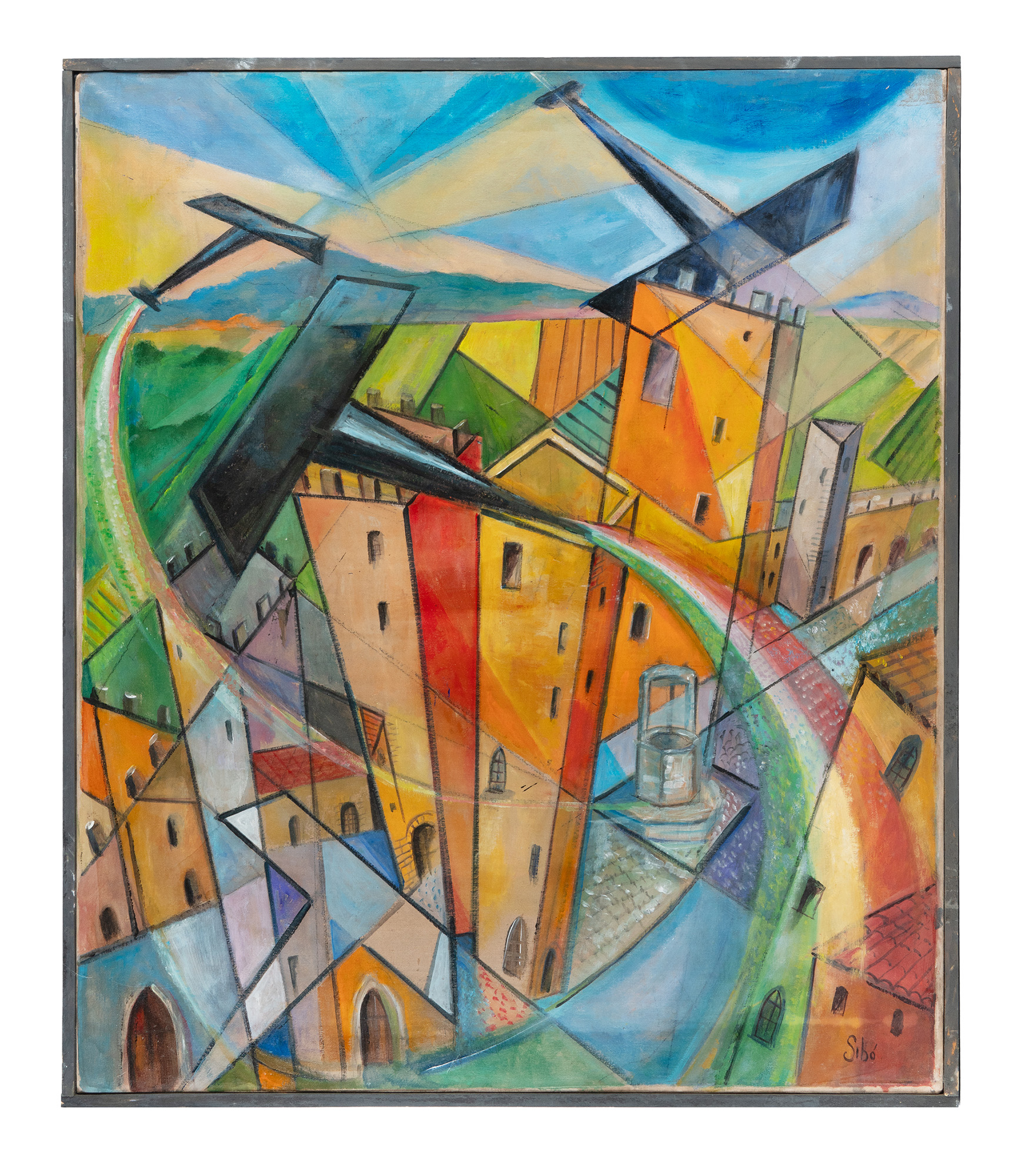 Sibò [Pseud. per Pierluigi Bossi], Spirali tricolori sul medioevo. 1936. Olio...