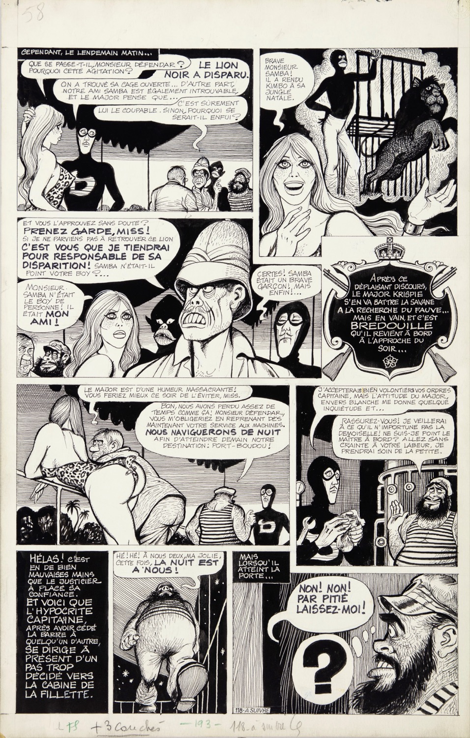 Tavola originale realizzata da Pichard per "Blanche Épiphanie", pubblicata a pag. 58 del secondo capitolo della saga omonima da Les Éditions du Fromage nel 1976. Creata da Pichard e Lob tra il 1972 e il 1987, le tribolazioni di Blanche Épiphanie sono tra le avventure più incredibili nel pantheon dei fumetti per adulti. La giovane e formosa Blanche viaggia per il mondo suo malgrado, cercando di proteggere la sua virtù. Tormentata dal perfido banchiere Adolfo e da una miriade di altri cattivi, invidiata da Morena, salvata dal ciclista Défendar, eroe mascherato e incappucciato ma di una goffaggine smisurata, la ritroviamo tra Africa e America nella Belle Époque.