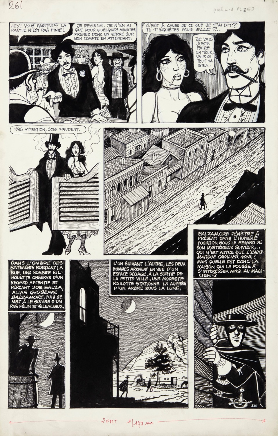 Tavola originale realizzata da Pichard per "Le cavalier noir", pubblicata a pag. 261 del quinto capitolo della saga di "Blanche Épiphanie" dalla casa editrice francese Éditions Dominique Leroy nel 1984. Creata da Pichard e Lob tra il 1972 e il 1987, le tribolazioni di Blanche Épiphanie sono tra le avventure più incredibili nel pantheon dei fumetti per adulti. La giovane e formosa Blanche viaggia per il mondo suo malgrado, cercando di proteggere la sua virtù. Tormentata dal perfido banchiere Adolfo e da una miriade di altri cattivi, invidiata da Morena, salvata dal ciclista Défendar, eroe mascherato e incappucciato ma di una goffaggine smisurata, la ritroviamo tra Africa e America nella Belle Époque.