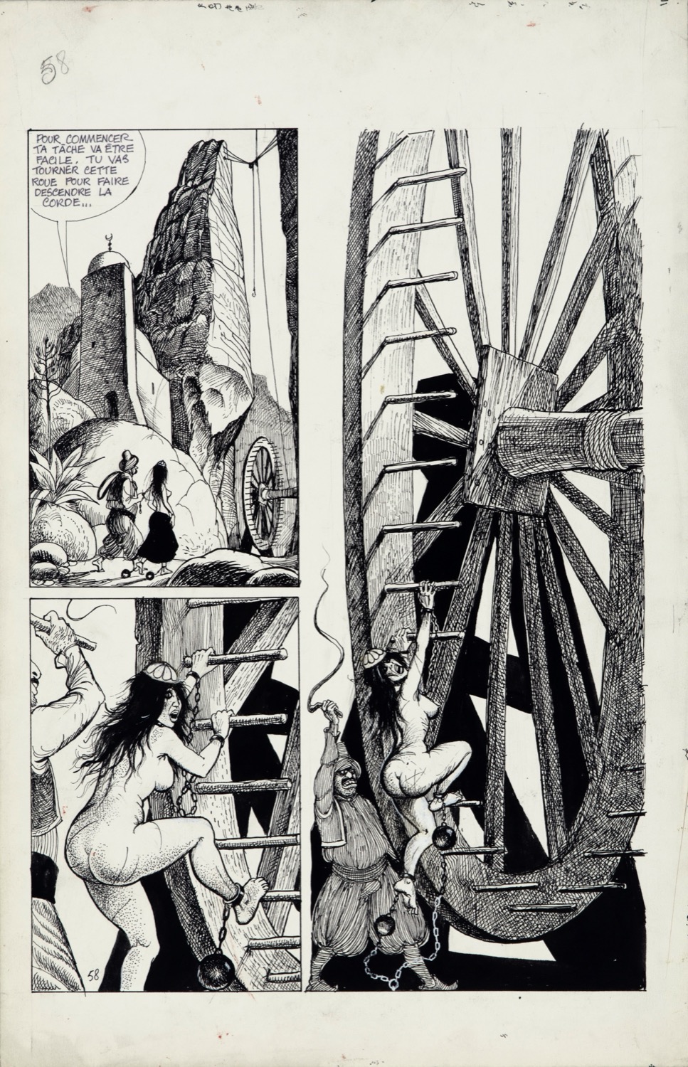 Tavola originale realizzata da Pichard per "Marie-Gabrielle en Orient", edita per la prima volta a pag. 58 dalla casa editrice francese Glénat nel 1981. La presente opera è stata inserita nel volume "Les 100 plus belles planches de la BD érotique" riprodotta a pag. 139 dalla casa editrice francese Beaux Arts éditions nel 2015. Lievi pieghe agli angoli.