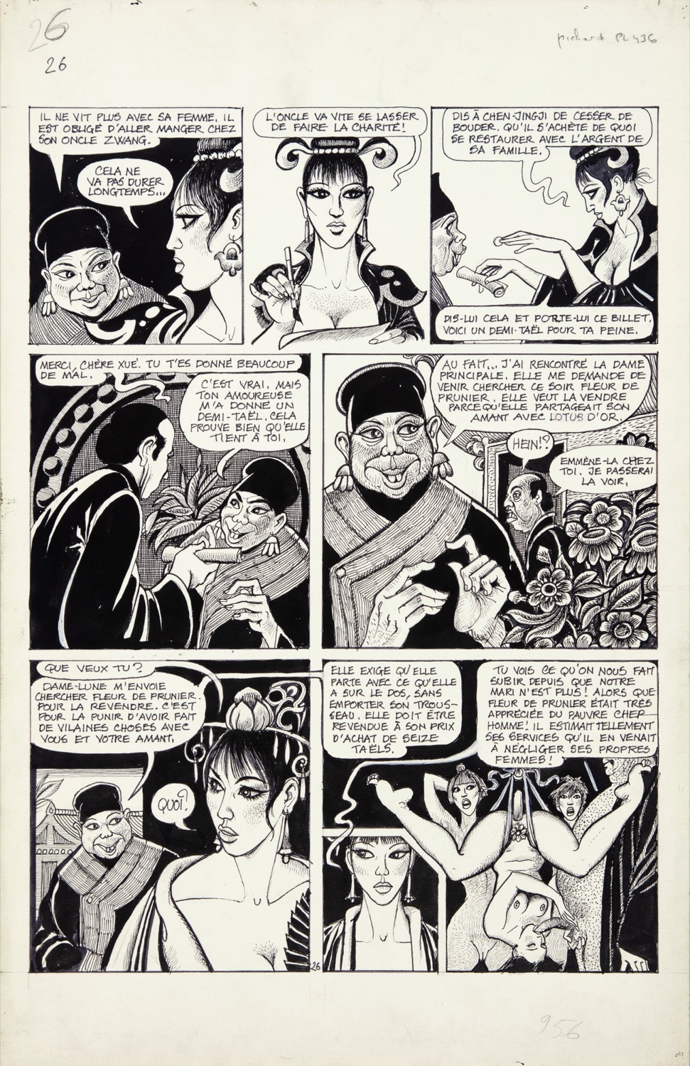 Tavola originale realizzata da Pichard per "Le fleurs du lotus", pubblicata a pag. 26 dalla casa editrice francese Albin Michel nel 1987. Seconda parte della famosa opera erotica orientale di Jin Ping Mei "110 Pillole", la cui prima parte fu disegnata da Magnus l'anno precedente.