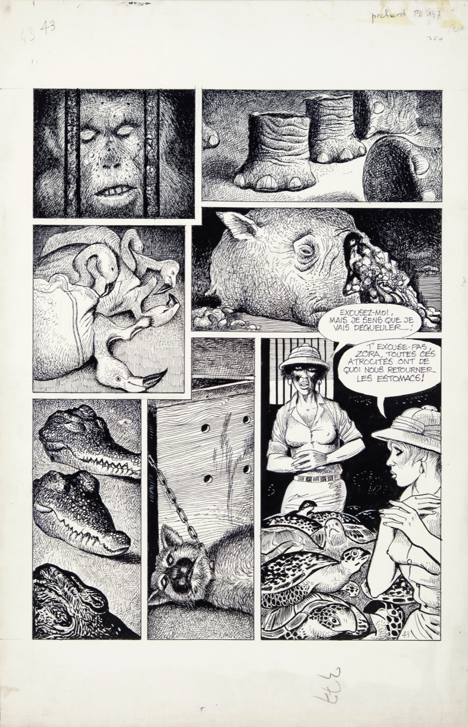 Tavola originale realizzata da Pichard per "Bornéo Jo", pubblicata per la prima volta in Francia su Charlie magazine a pag. 43 dall‘editore Dargaud nel 1982. Pichard ci trasporta in atmosfere esotiche tra le isole del Borneo dove un orango, grazie a una pietra magica, ottiene la capacità di parlare e di apparire come un gentiluomo. Un gruppo di giovani e sensuali fanciulle sono irrefrenabilmente attratte da lui e, come le celebri Charlie's Angels, cominciano a vivere incredibili avventure, tra magia, erotismo, e un pizzico di ironia.