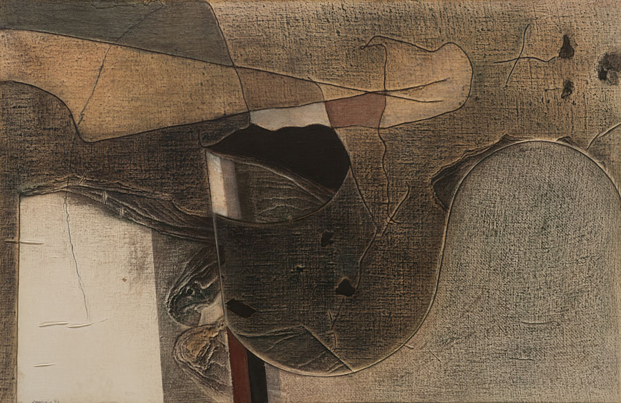 Felice Canonico (Messina 1922 - Milano 1996) - "Approdo" 1970 olio e tecnica mista su tela, cm 70x116 Firmato e datato 70 in basso a sinistra Firmato, titolato e datato 70 al retro Provenienza Falchi Arte Moderna, Milano