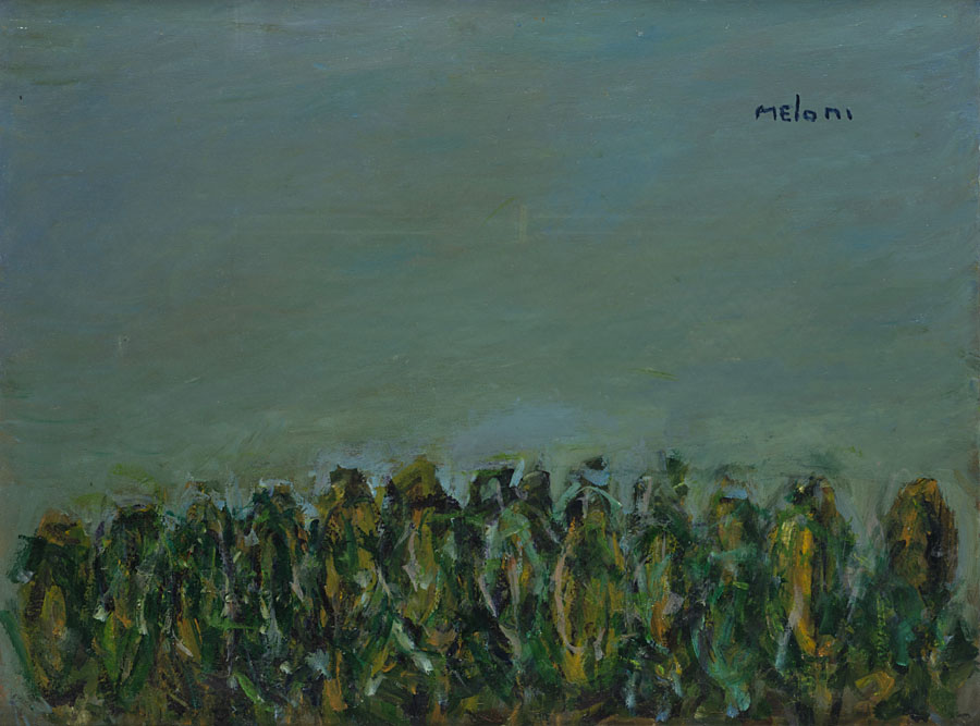 Gino Meloni (Varese 1905 - Lissone 1989) - "Granoturco" 1985 olio su tela, cm 62,5x82 Firmato in alto a destra Firmato, titolato e datato 1985 al retro Provenienza Galleria delle Ore, Milano