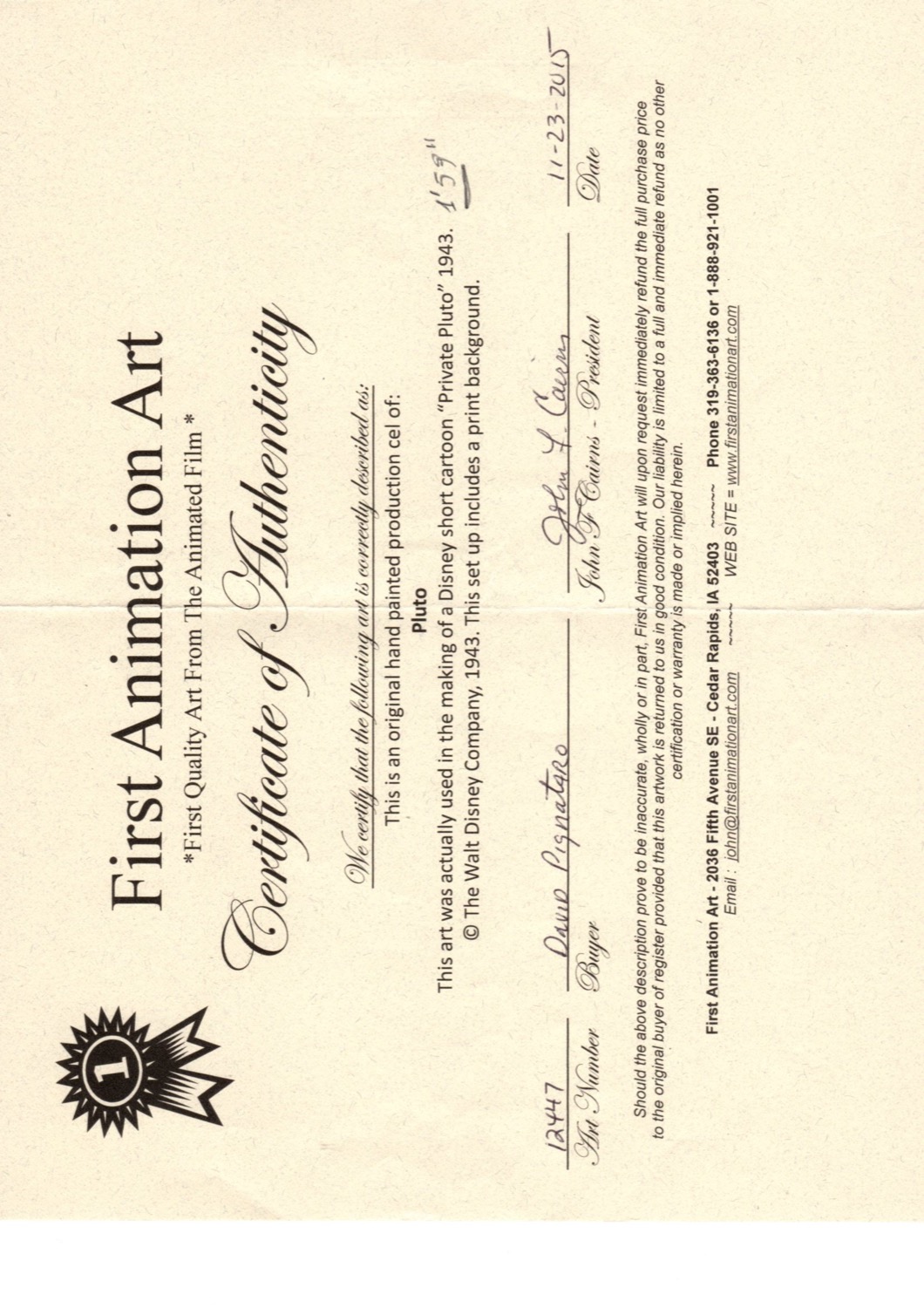 Cel originale su fondale riprodotto per il cortometraggio animato "Private Pluto", diretto da Clyde Geronimi e prodotto dalla Walt Disney Productions nel 1943. Pluto è un cane da guardia in una base militare. All'inizio cerca di seguire gli ordini di marcia, poi gli viene detto che ci sono dei sabotatori, e viene messo a guardia di un fortino. Deve così vedersela con Cip e Ciop (questo cortometraggio rappresenta la loro prima apparizione). Ondulature della cel. Si allega certificato di autenticità della galleria di provenienza.