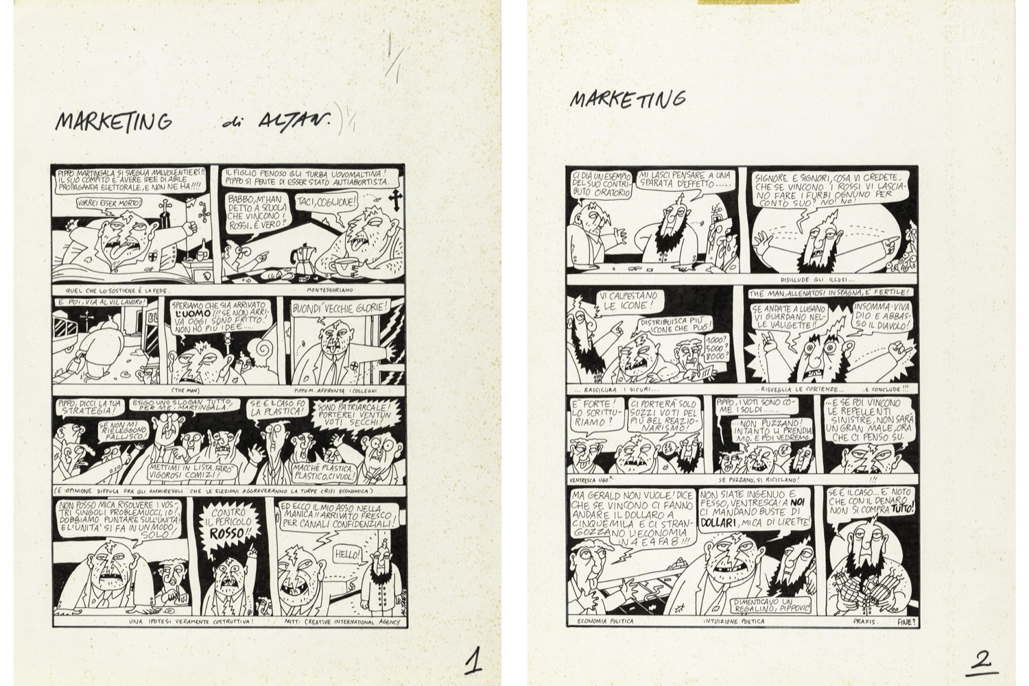 Storia completa composta da 2 tavole originali realizzate da Altan intitolata "Marketing", edita come inserto Linus all'interno della rivista musicale Muzak n. 13 del Giugno 1976. Lievi tracce di foxing, lieve piega all'angolo superiore sinistro. Si allega la pubblicazione dell'epoca. Firmata.
