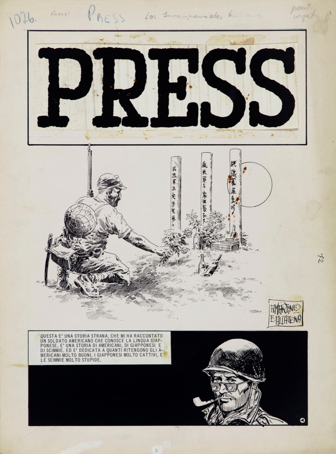 Tavola originale realizzata da Alcatena per la pag. 1 di "Los incomprensibles humanos", sesto capitolo della serie "Press" edita su Lanciostory nel 1978. Lievi pieghe ai margini. Firmata.