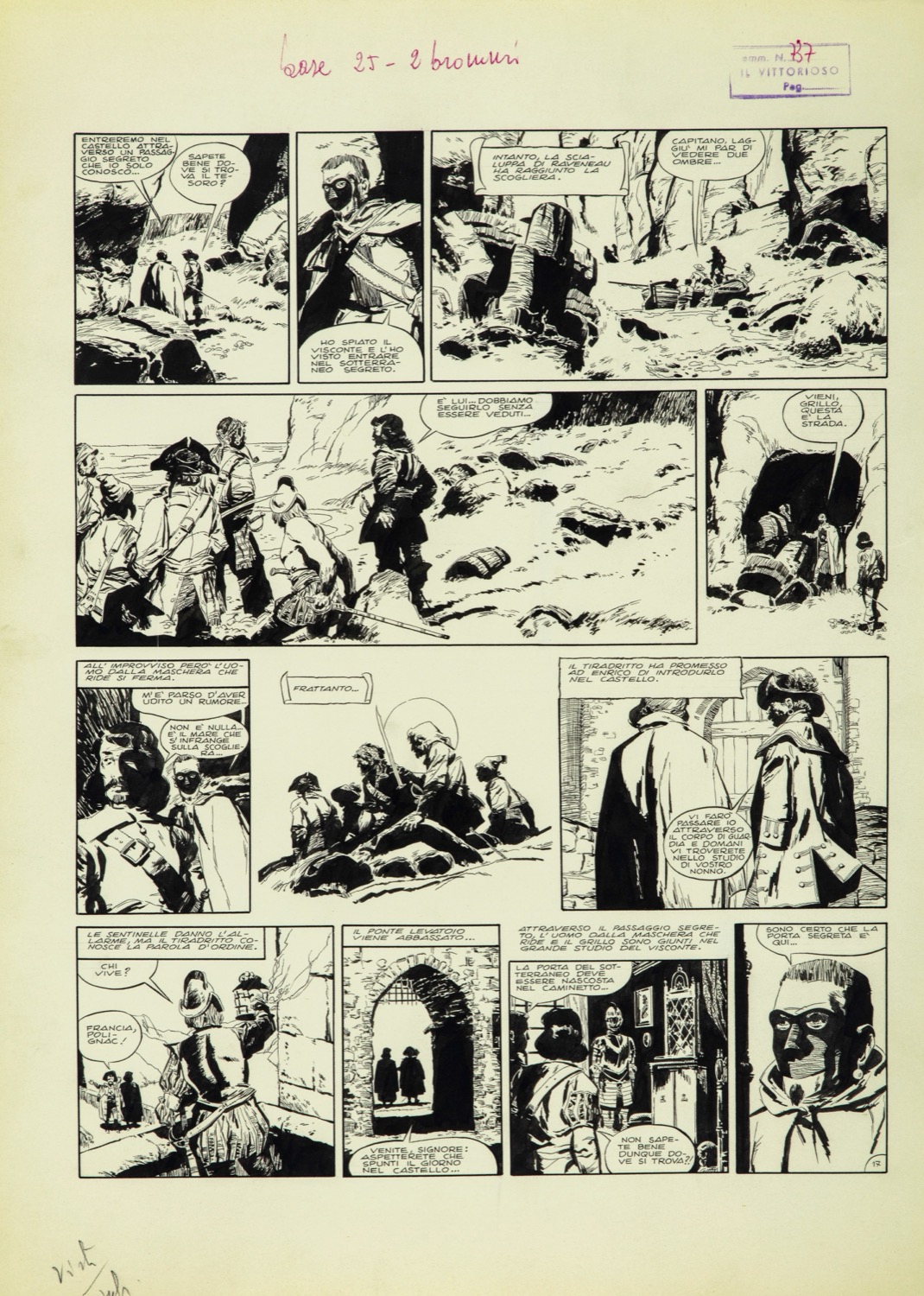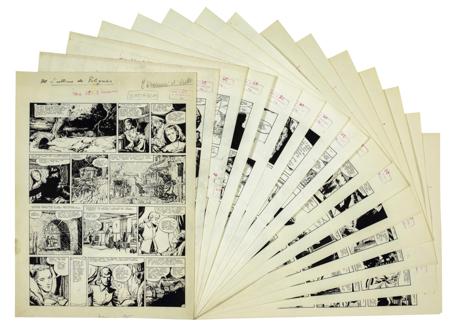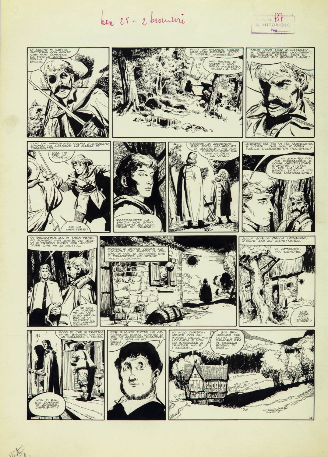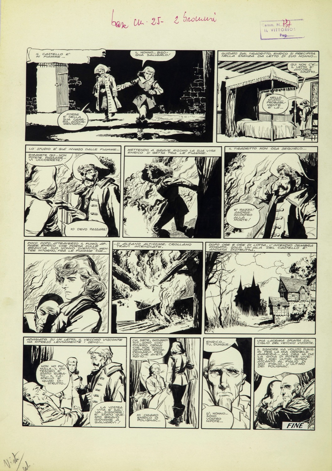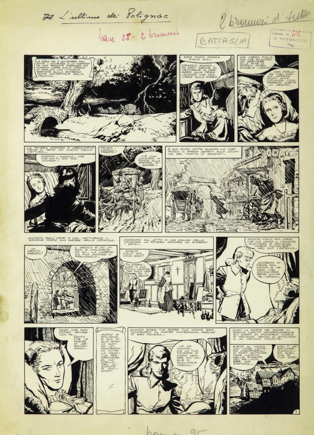 Storia completa composta da 20 tavole originali realizzate da Battalia per "L'ultimo dei Polignac", avventura cavalleresca ambientata nella Francia di fine '600, pubblicata per la prima volta sulle pagine de Il Vittorioso dal n. 28 al n. 41 del 1957. Un'opera intensa caratterizzata dal quel virtuosismo grafico che segna il primo periodo artistico di Battaglia, già proiettato verso quella maturità che lo collocherà tra i più grandi maestri del fumetto mondiale.