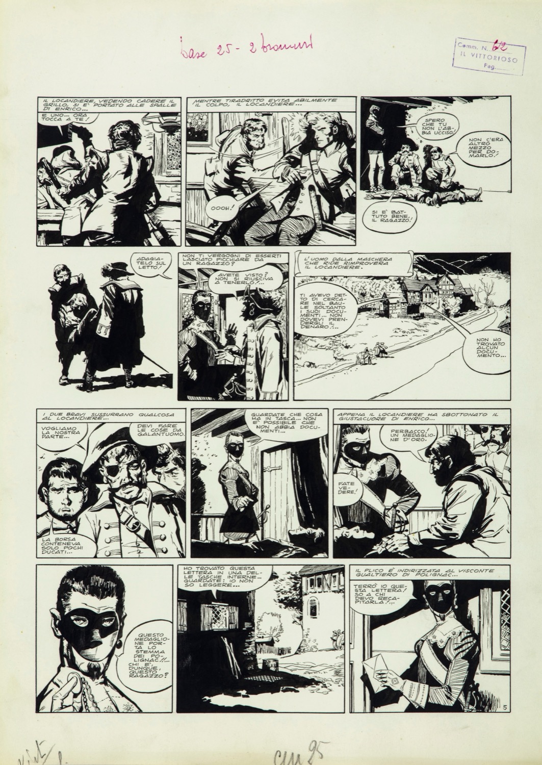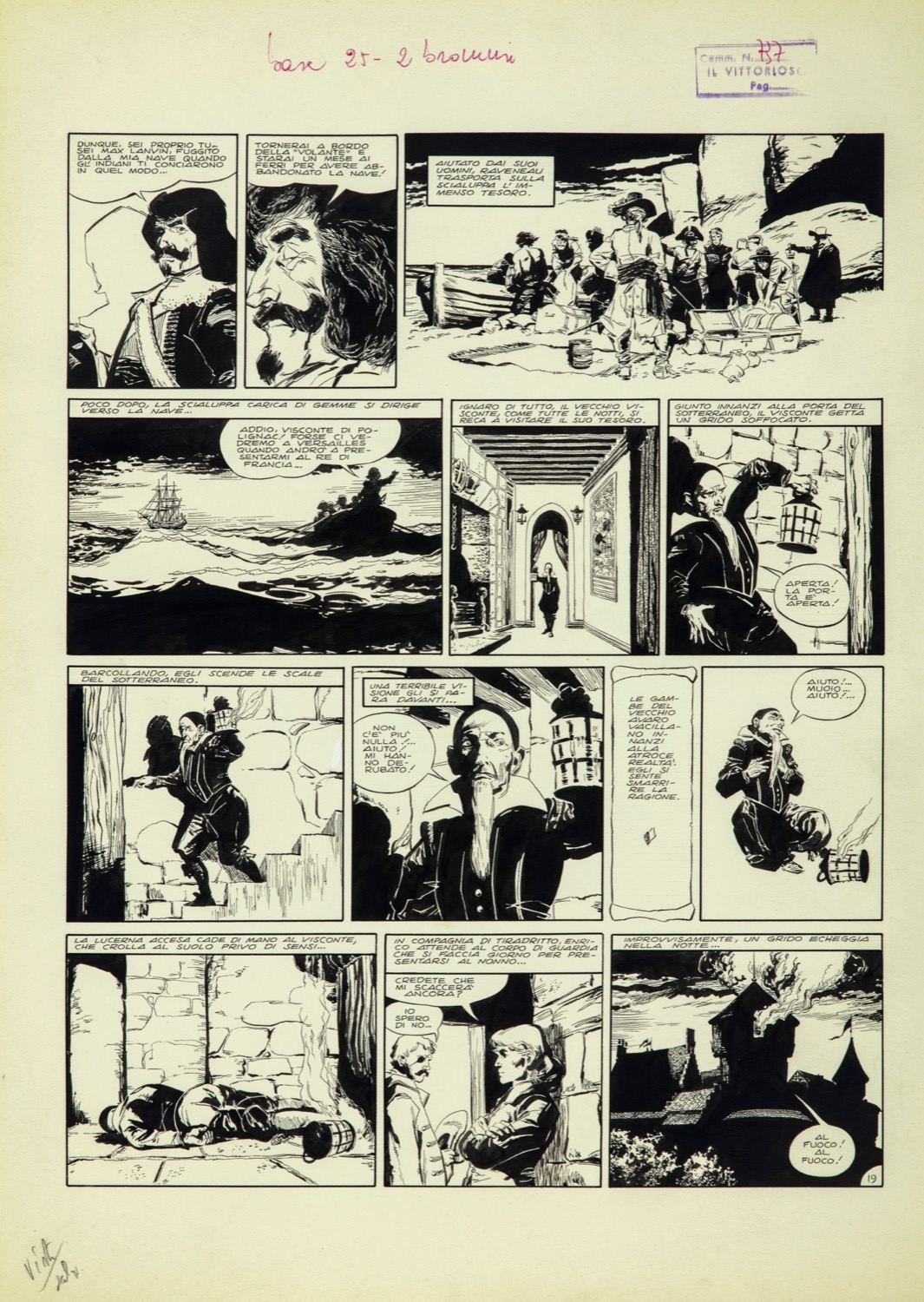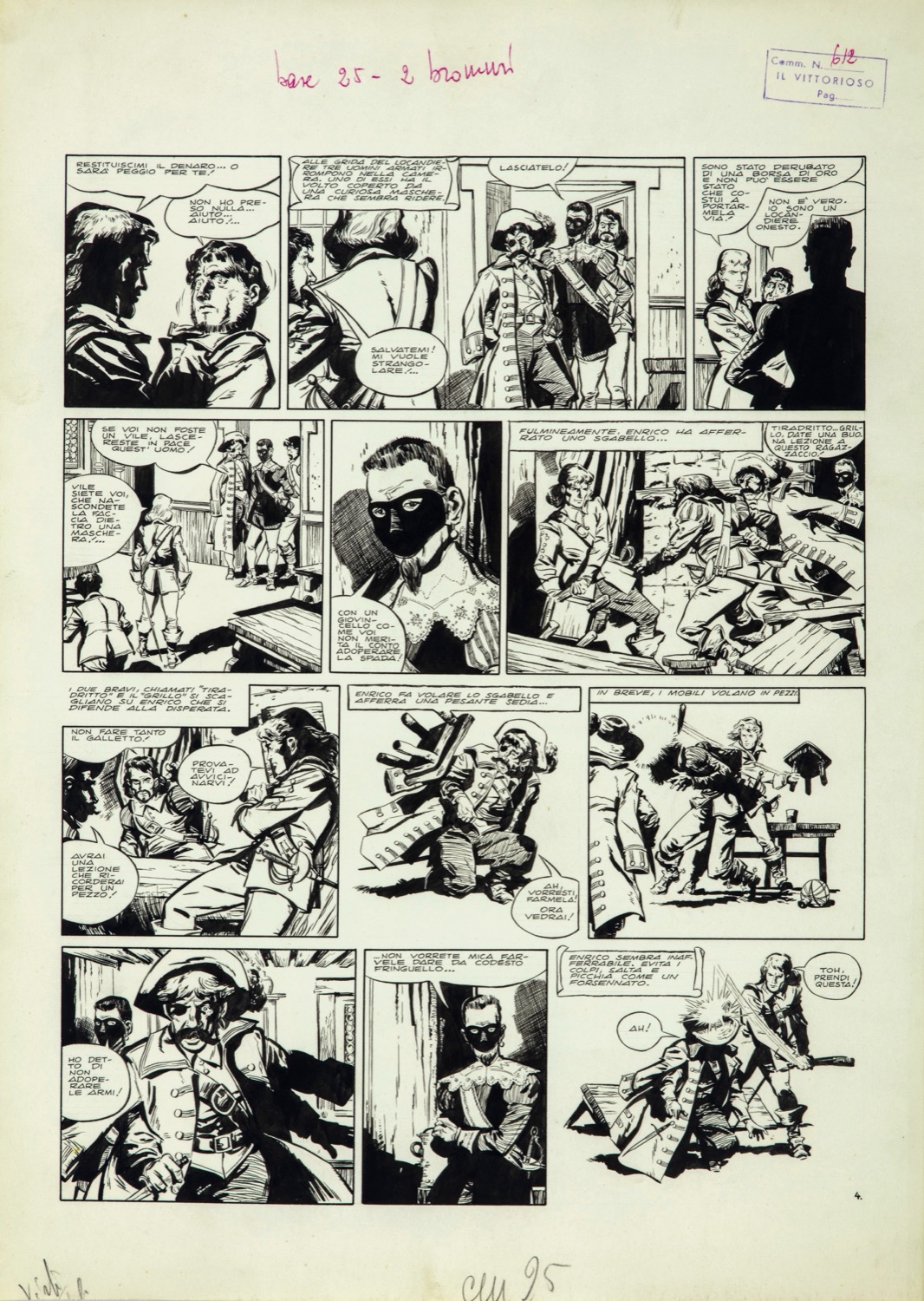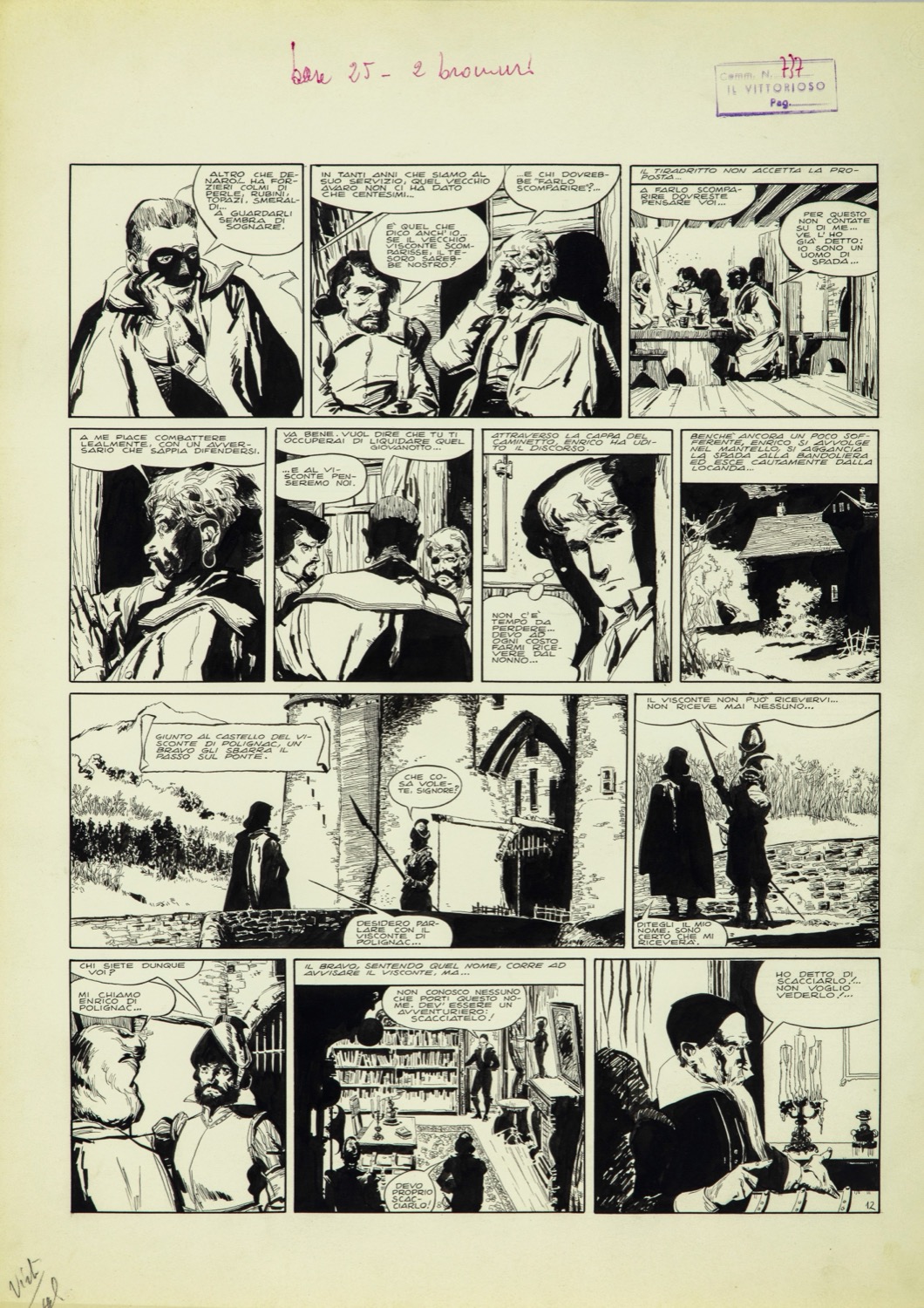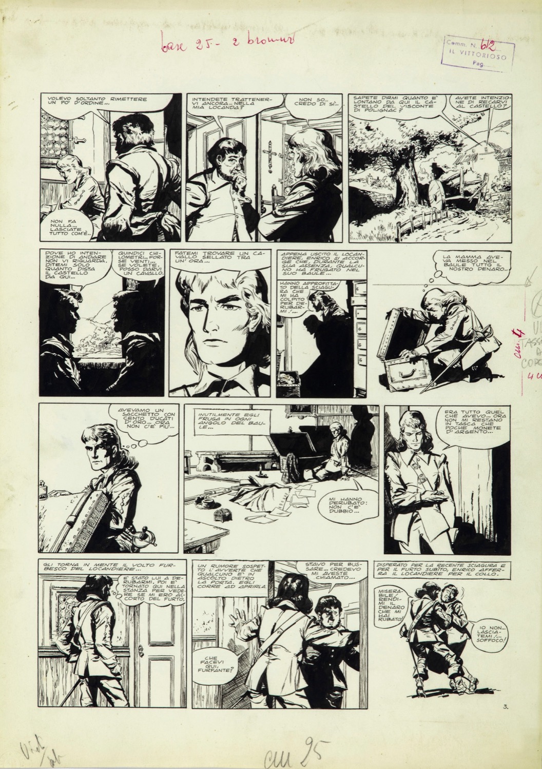 Storia completa composta da 20 tavole originali realizzate da Battalia per "L'ultimo dei Polignac", avventura cavalleresca ambientata nella Francia di fine '600, pubblicata per la prima volta sulle pagine de Il Vittorioso dal n. 28 al n. 41 del 1957. Un'opera intensa caratterizzata dal quel virtuosismo grafico che segna il primo periodo artistico di Battaglia, già proiettato verso quella maturità che lo collocherà tra i più grandi maestri del fumetto mondiale.