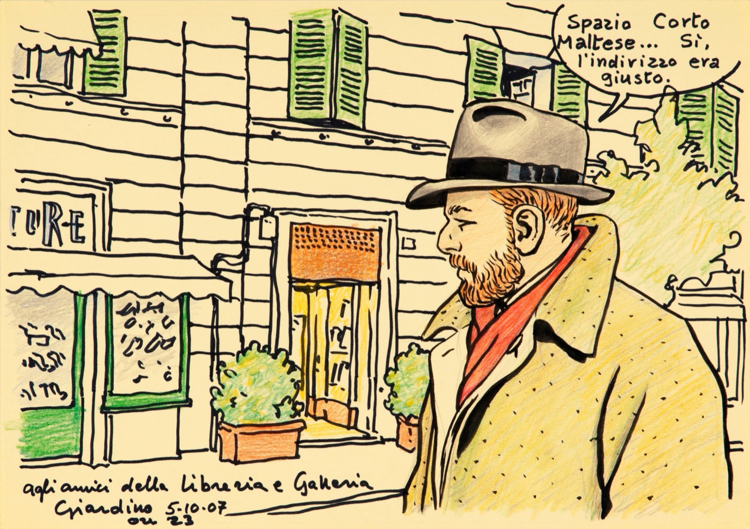 Disegno originale realizzato da Giardino in occasione di una sua presentazione presso la Galleria Spazio Corto Maltese a Roma nel 2007. Firmato, datato e dedicato.