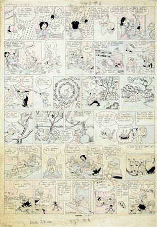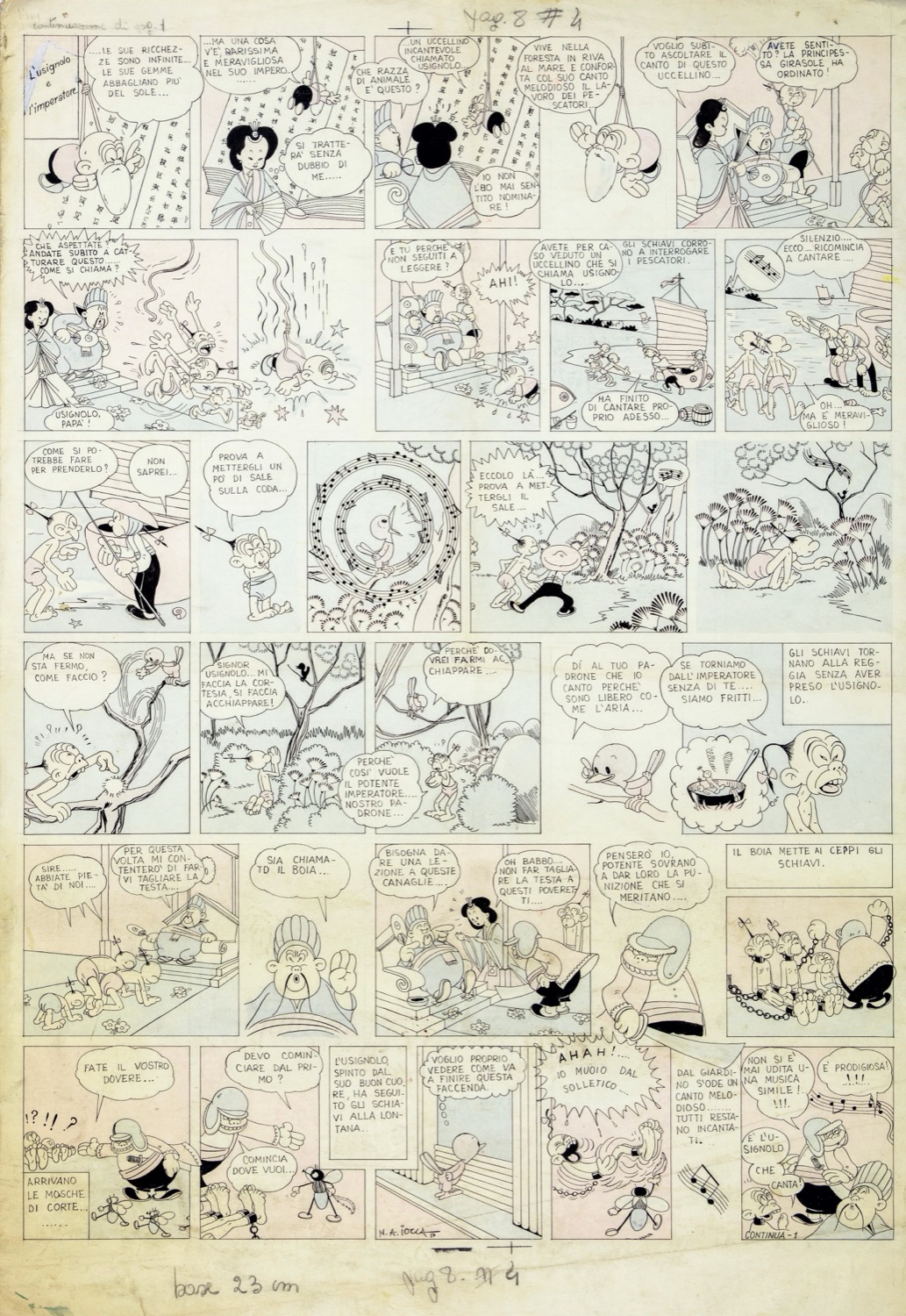 Tavola originale realizzata da Iocca per la pag. 8 de "L'usignolo e l'imperatore" del 1950. Iocca è celebre per essere stato l'autore della segnaletica del Codice della strada italiano. Lievi pieghe. Acquerellata al retro. Firmata e datata.