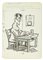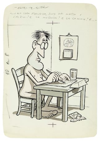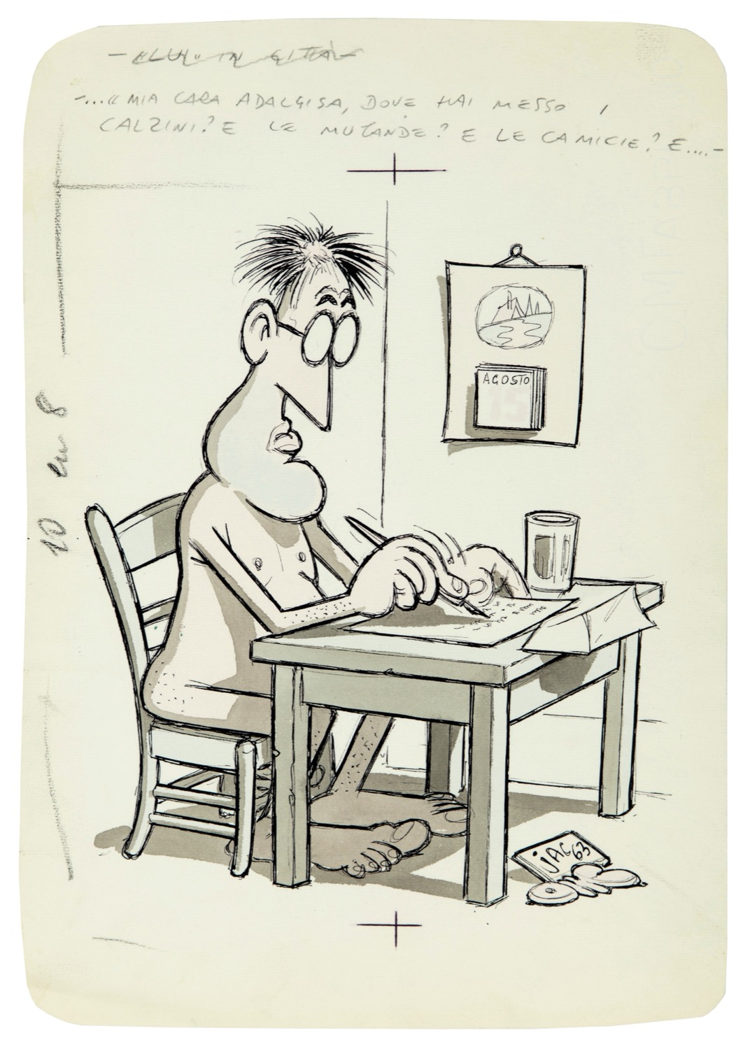 Illustrazione originale realizzata da Jacovitti per il paginone domenicale del quotidiano Il Giorno. " Mia cara Adalgisa, dove hai messo i calzini? E le mutande? E le camicie? E … ". Acquerellata al retro. Firmata con lisca di pesce e datata.