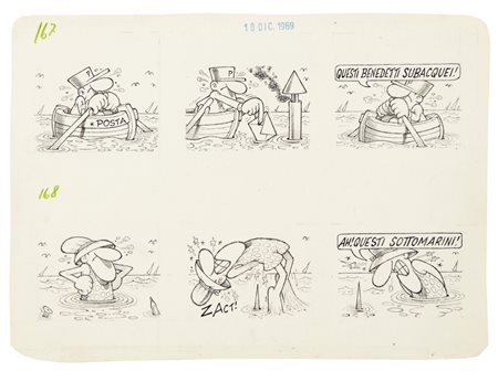 Disegno originale realizzato da Jacovitti contenente 6 vignette originali pubblicate sulle pagine del Diario Vitt 1969/1970 dalle Edizioni AVE. Lieve piega diagonale al centro.