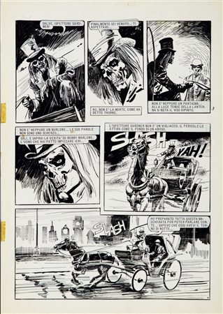 Tavola originale realizzata da Lalia per la storia intitolata "I misteri di Londra" tav. 7, edita sulle pagine della rivista Lanciostory n. 25 del 1978. Opera recentemente pubblicata sul volume "I misteri di Londra: Tredici indagini dell'ispettore Bull" dalla 001 Edizioni nel 2017. Lieve piega all'angolo superiore sinistro.