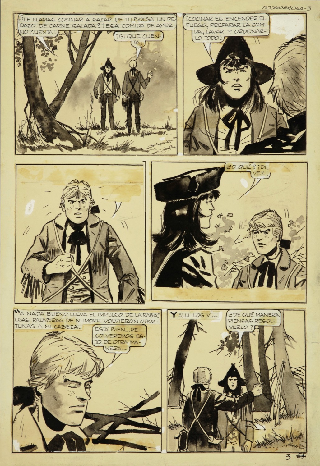 Tavola originale realizzata da Pratt per "Ticonderoga", pubblicata dall'Editorial Frontera nel 1957. In questa storia ambientata nel Nord America del XVIII secolo, durante le battaglie tra francesi e inglesi per la conquista dei territori dei Grandi Laghi, i protagonisti sono tre giovani: il cadetto di Sua Maestà Britannica Caleb Lee, lo smaliziato Joe Flint, detto Ticonderoga, e il nativo americano Numockh. I fondali dell'avventura sono costituiti da boschi, da foreste e da una natura selvaggia e incontaminata dove si muovono silenziosi i mocassini indiani a far da contrasto ai rumorosi spostamenti dei soldati venuti dall'Europa. In questo lavoro, Pratt utilizza la tecnica della mezza tinta, quasi a rendere più avvincente e fascinosa la simbiosi dell'uomo con la natura, rotta qui da una guerra che porterà, da lì a poco, alla nascita di una nazione. Piccolo strappo al margine destro. Testi di Héctor G. Oesterheld.