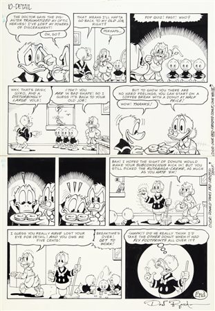 Tavola originale realizzata da Don Rosa per "An Eye for Detail", edita per la prima volta in Danimarca nel 1997 e successivamente in Italia con il titolo "Paperino in occhio ai dettagli" su Zio Paperone n. 107 nel 1998. Quella da noi presentata è la tavola finale di questa avventura in cui Zio Paperone vorrebbe sfruttare l‘inconscio talento di Paperino nel riuscire a distinguere perfettamente Qui, Quo e Qua. Su due pannelli. Firmata.