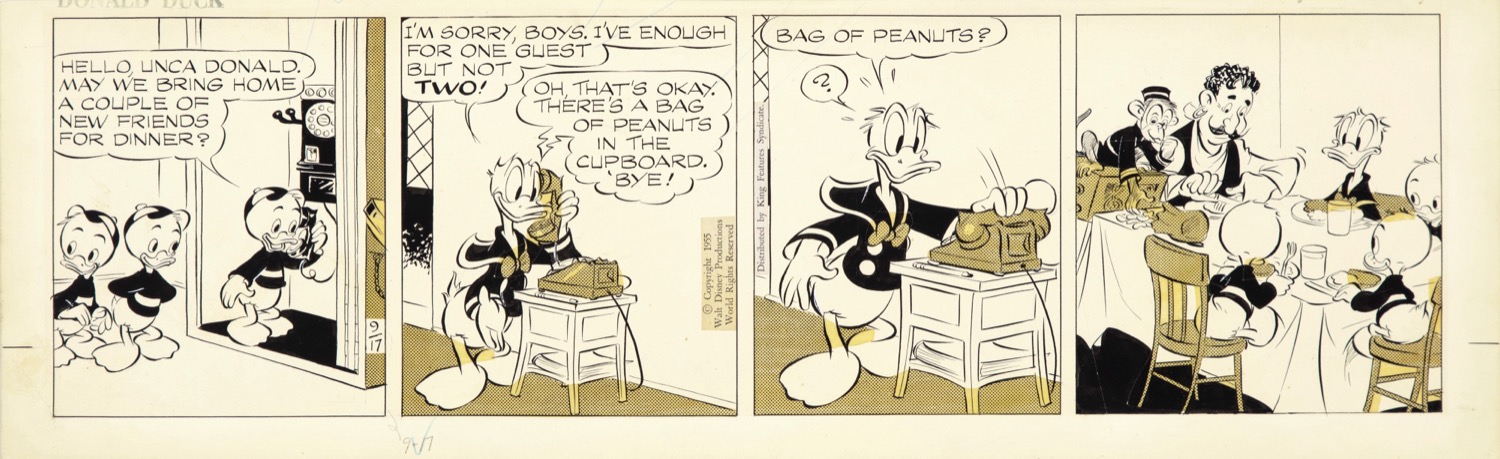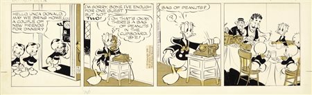 Striscia giornaliera del 17/09/1955 per "Donald Duck". Taliaferro è considerato uno dei più illustri genitori del personaggio di Paperino, grazie a lui il giovane papero diventa una delle star della famiglia Disney. Lieve piega all'angolo inferiore sinistro.