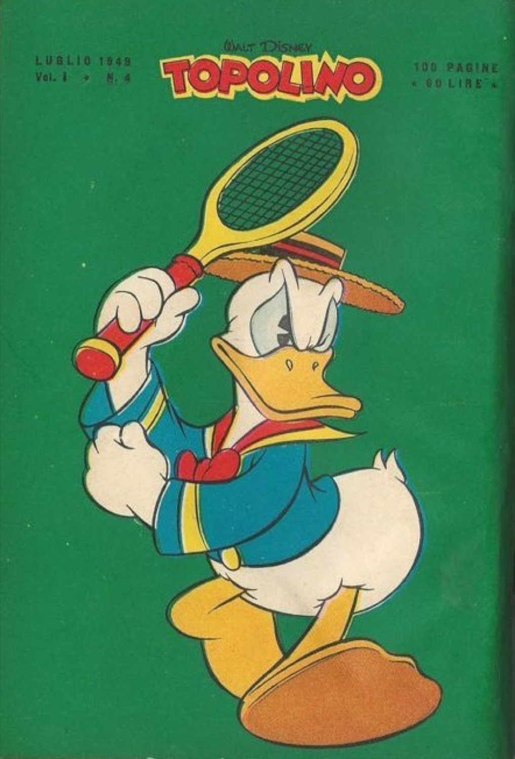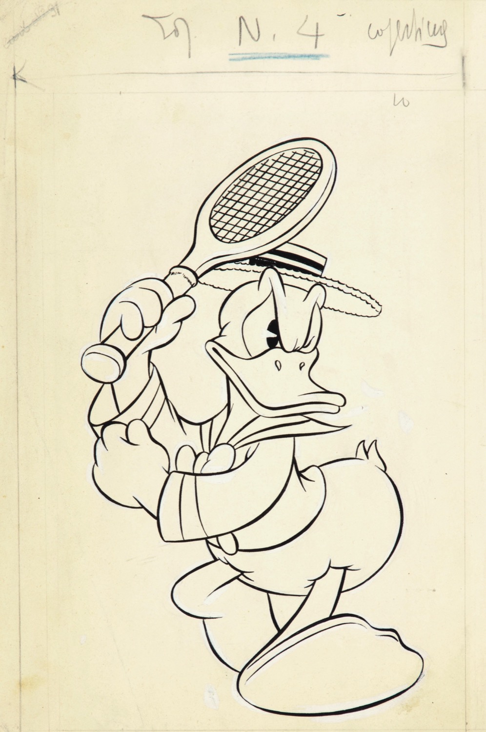 Disegno originale per la quarta di copertina realizzato da Vergani per Topolino n. 4 edito dalla Mondadori nel Luglio 1949. Tra i più iconici ritratti di Paperino "prima maniera" mai realizzati in Italia. La più antica copertina di Topolino mai apparsa sul mercato, un pezzo da museo. Lieve piega all'angolo inferiore sinistro e piega all'angolo superiore sinistro.