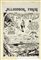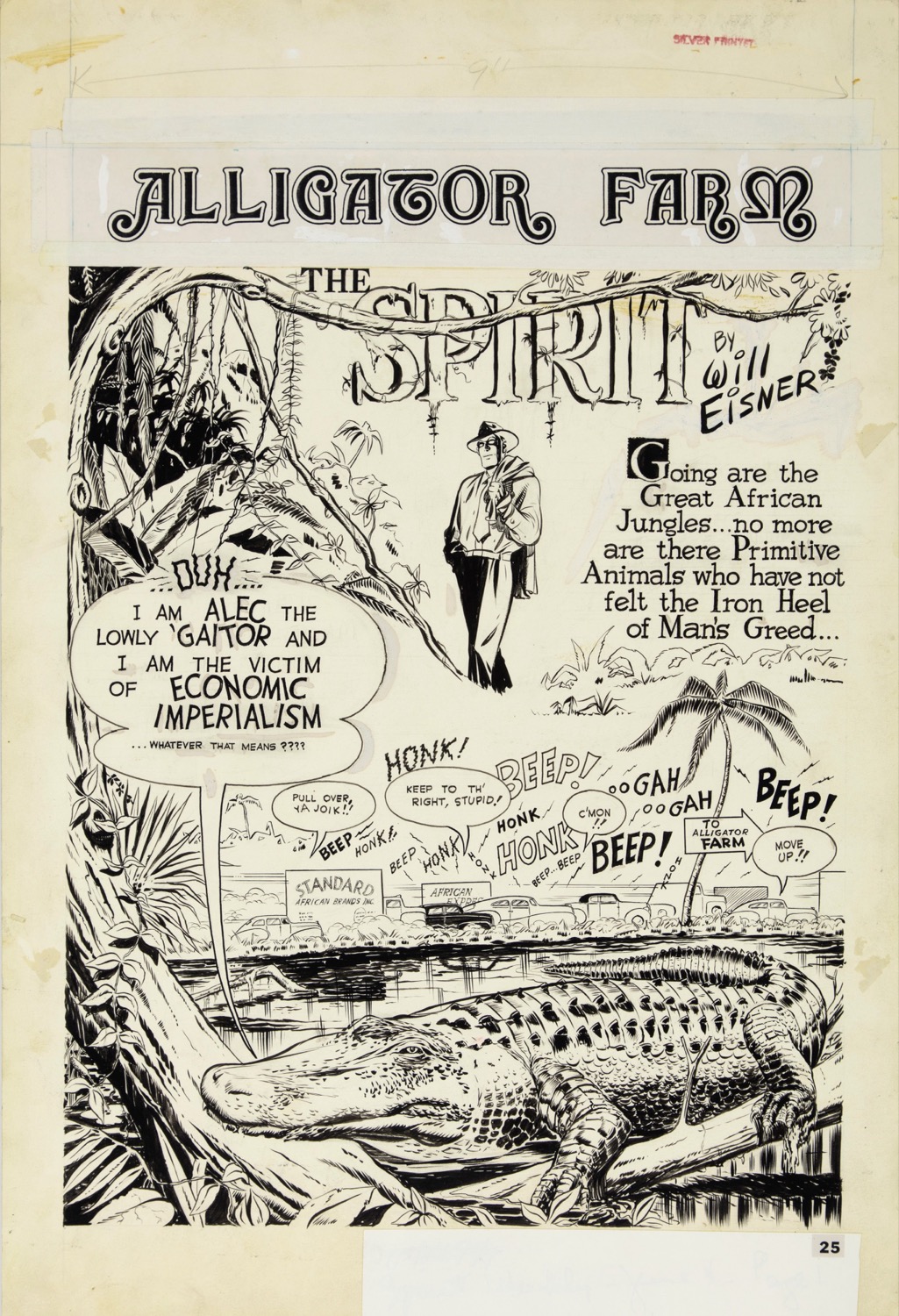 Title page originale realizzata da Eisner per "Alligator Farm", avventura di The Spirit pubblicata per la prima volta sui quotidiani americani il 4 Giugno 1950. Non tutte le storie di Eisner si svolgono nella grande metropoli, Eisner credeva nella nozione di città come un essere quasi vivente, che si rifletteva nelle sue storie di The Spirit, pertanto per i lettori era sempre uno shock quando le storie si svolgevano fuori da Central City, ma quando questo accadeva, le title page (segno distintivo della poetica di Eisner) risaltavano ancora di più del solito, come questa sbalorditiva title di "Alligator Farm", che contrappone esplicitamente l'abitat incontaminato dell'alligatore al trambusto della città. Un altro segno distintivo di The Spirit, che veniva spesso esposto nelle title page, era il talento di Eisner nell'adottare prospettive non convenzionali per inquadrare le sue storie. Per spiazzare i giovani lettori alcune storie erano raccontate dal punto di vista di animali o persino di oggetti inanimati, in questo caso è lo stesso alligatore ad essere la voce narrante di questa avventura ambientata nell'Africa orientale; senza dubbio questa è un'estensione della stessa volontà di sperimentare che ha inaugurato l'originalità e il virtuosismo delle tanto ricercate title page di The Spirit. Un pezzo da museo.