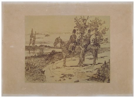 GIOVANNI FATTORI 1825 - 1908 Cavalleggeri in perlustrazione 1883-1884 Litografia coeva. Firma sulla lastra in b. a s. (30 x 42,3 foglio - 21 x 27 lito.) Opera appartenente alla cartella dei “Venti ricordi dal vero” pubblicata nel 1884 dalla Cromolito Pistoiese. L’opera è stampata su carta marroncina e applicata a cartoncino bianco. La tiratura fu di pochissimi esemplari (circa 10). 13 pietre furono distrutte durante la Seconda Guerra Mondiale; delle 7 restanti sono da segnalare 2 tirature postume: una del 1961 edita da Aldo Gonnelli, Firenze in 100 es.; l’altra del 1978 eseguita da Giorgio Upiglio, Milano per l’Editrice Marsilio in 135 es. Entrambe le tirature furono eseguite su carte bianche.