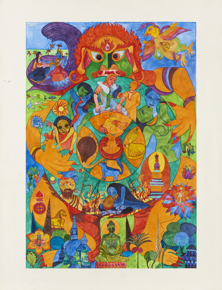HOFER HERTA (n. 1936) SURREALE INDIANO (OROSCOPO TIBETANO). 1972. Tecnica mista su cartone pressato. Cm 50,00 x 65,50. firma e data