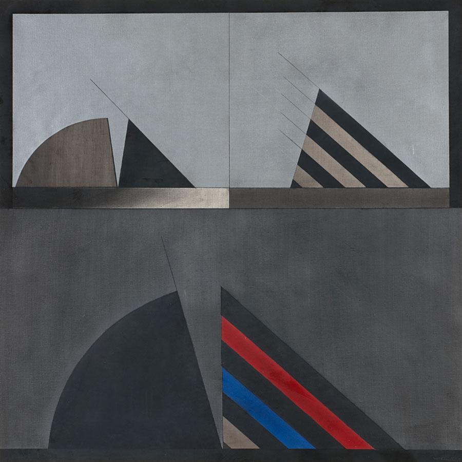 Walter Valentini (Pergola 1928) - "La storia della mia piazza" 1974 tecnica mista su tela, cm 100x100 Firmato, titolato e datato 1974 al retro Provenienza Galleria Vinciana, Milano