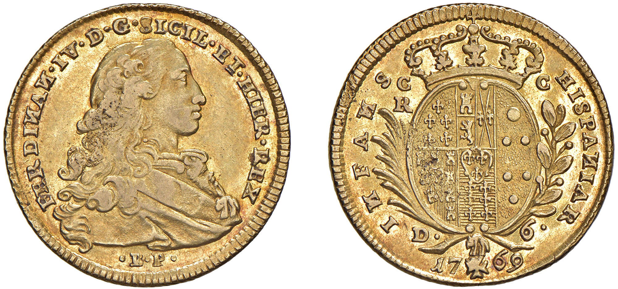 NAPOLI - FERDINANDO IV (1759-1816) - 6 ducati 1769, VII tipo.Oro, 8,80 gr. - Diam. 26 mm.Dritto: Busto a destra con capelli fluenti; - Rovescio: Stemma coronato.Gigante 10Lievi debolezze e screpolature di conio. Rovescio di ottima freschezza.Complessivamente q.SPL