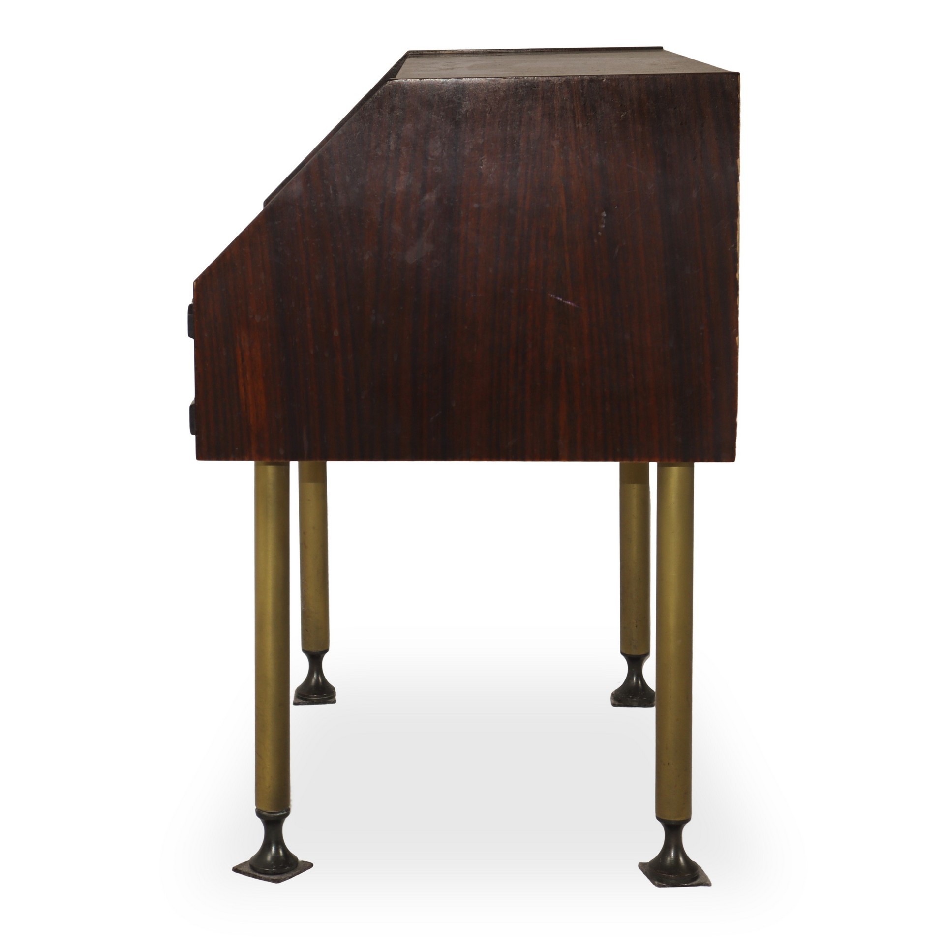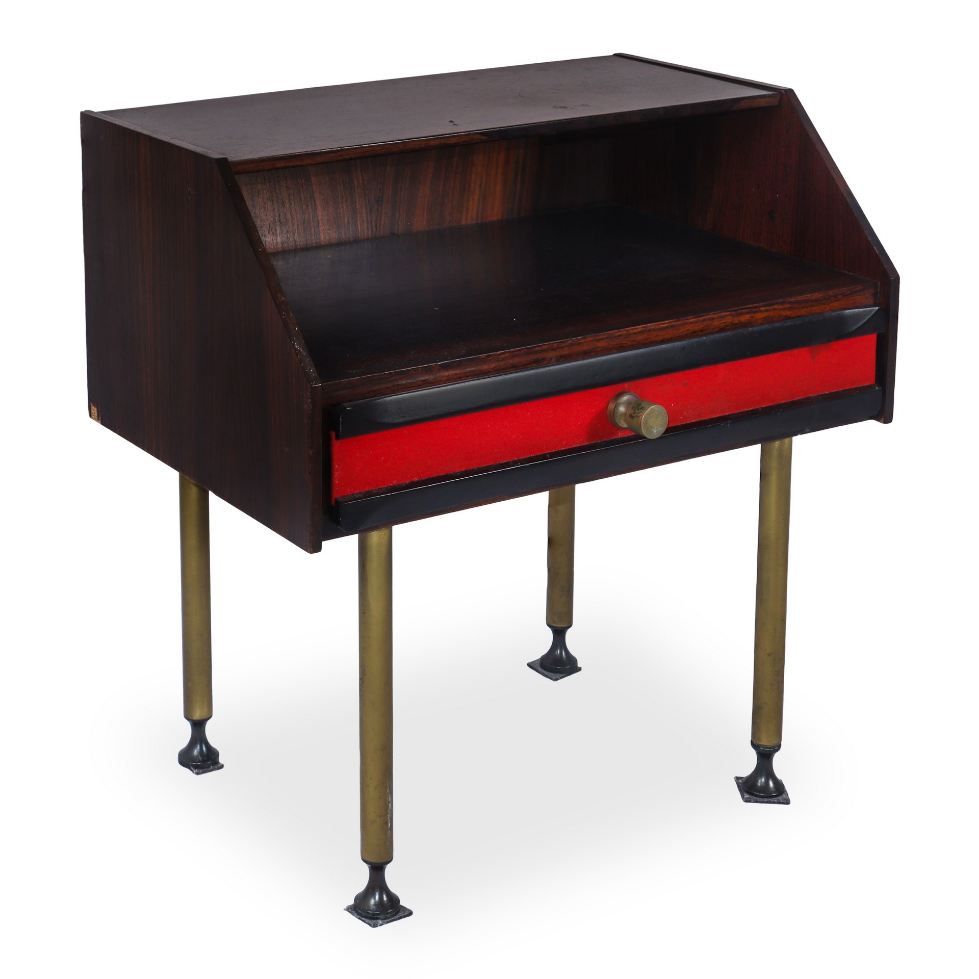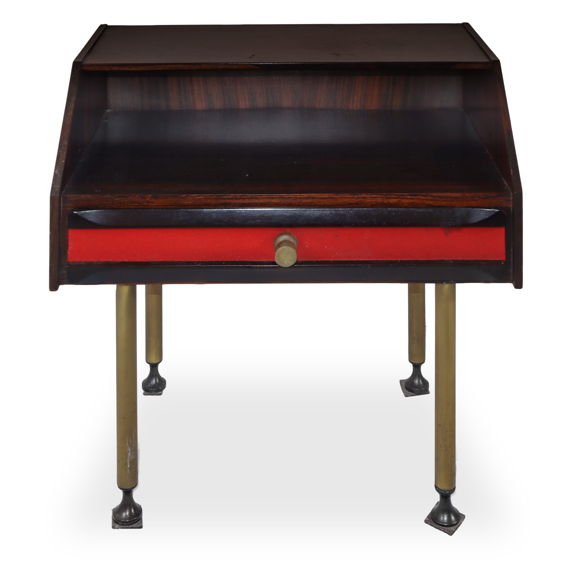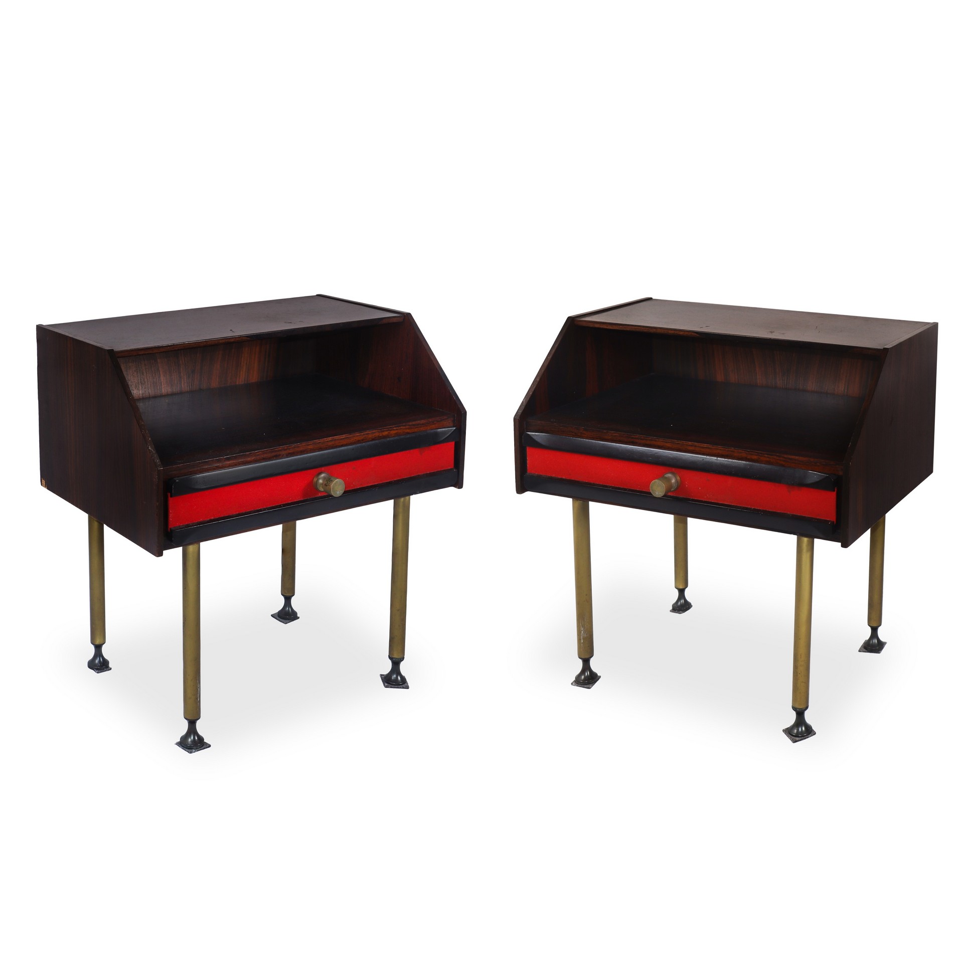 Coppia di comodini in legno di palissandro con riporti in tessuto rosso e pomelli e piedi in ottone , 60's