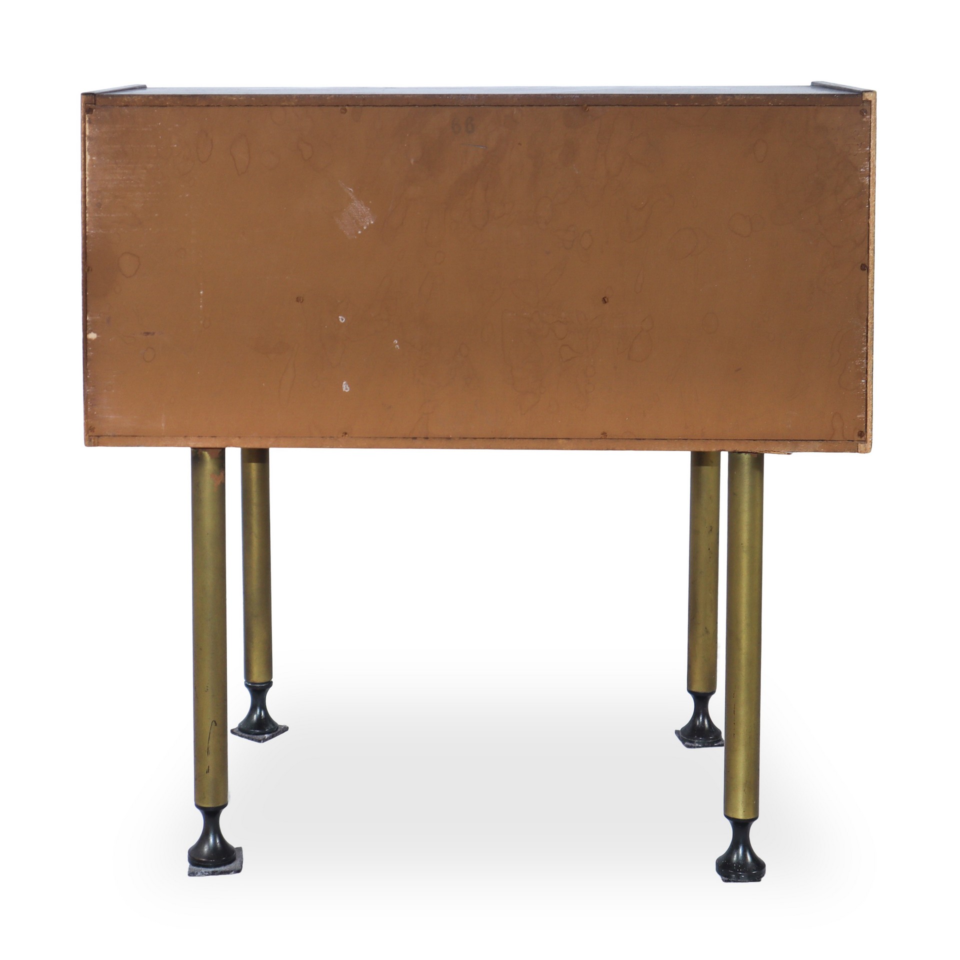 Coppia di comodini in legno di palissandro con riporti in tessuto rosso e pomelli e piedi in ottone , 60's h cm 56,5X55X40