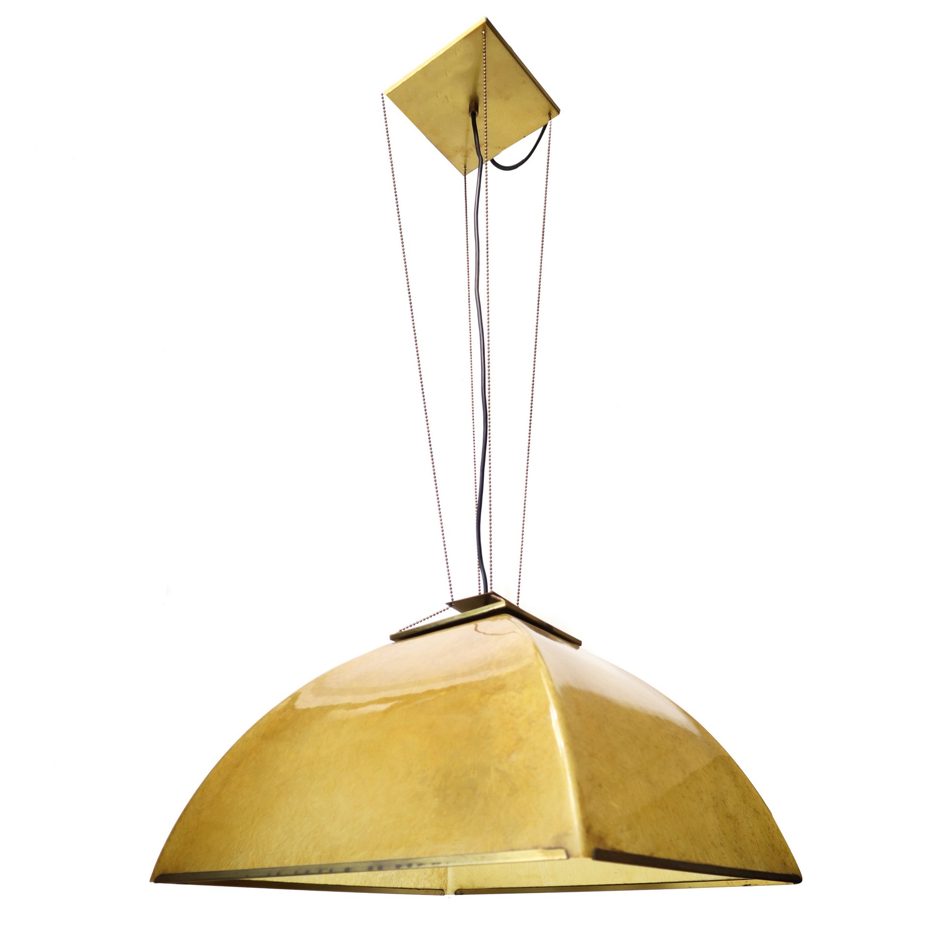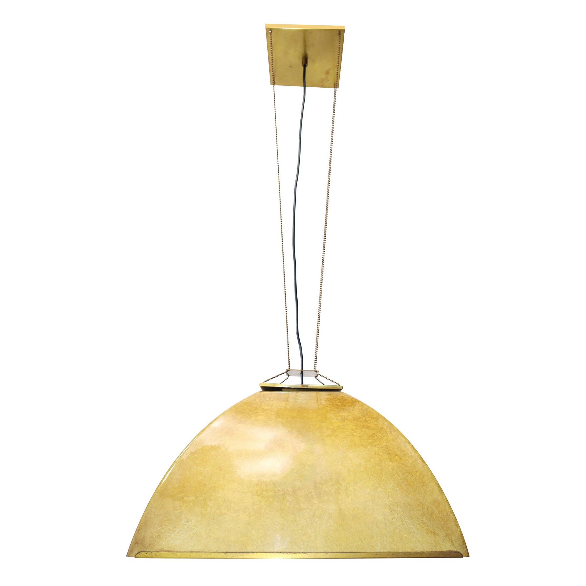 Produzione Valenti (attribuito a) (1929) - Lampada a sospensione con struttura in fibra di vetro, 1960s H cm 105 x L cm 55 Nei toni del giallo, dettagli in ottone zapponato e finitura lucida, segni d'uso.Nei toni del giallo, dettagli in ottone zapponato e finitura lucida, segni d'uso.