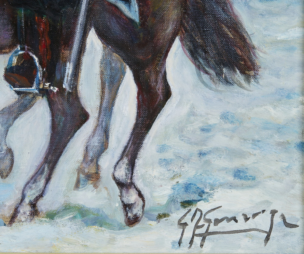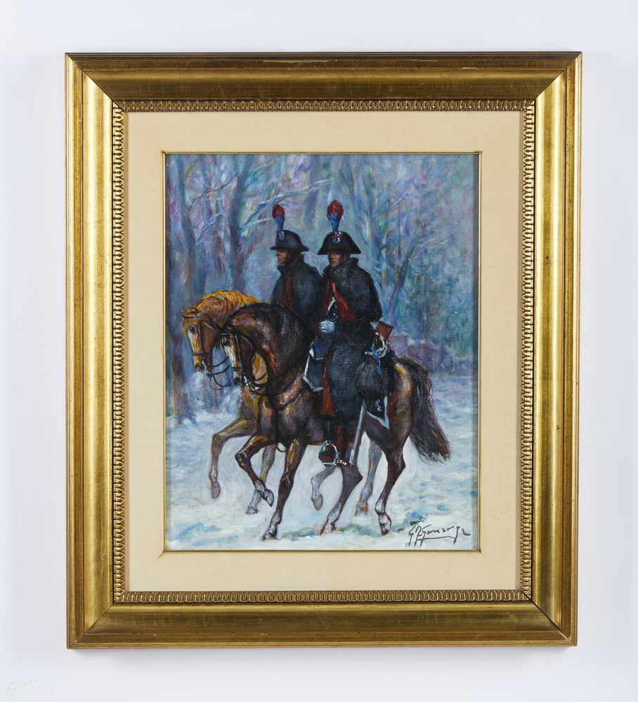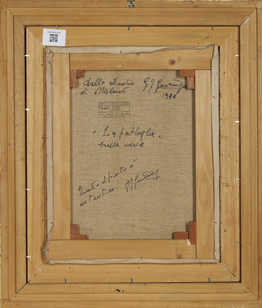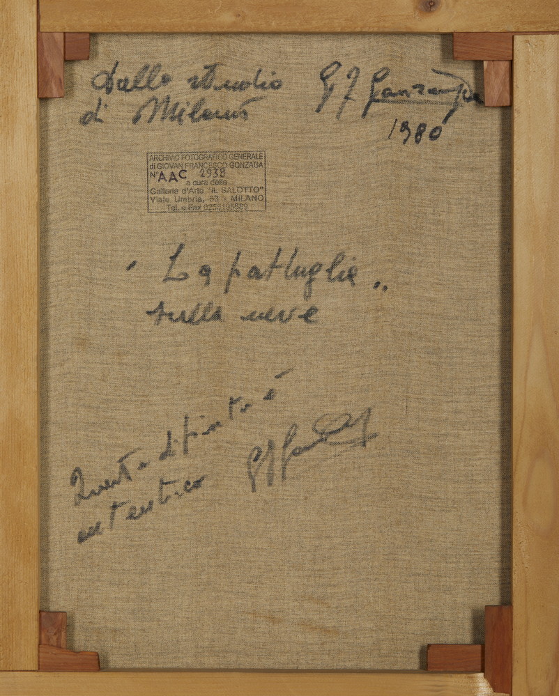GONZAGA GIOVANFRANCESCO (1921 - 2007) PATTUGLIA SULLA NEVE . 1980. Olio su tela. Cm 40,00 x 50,00. firma