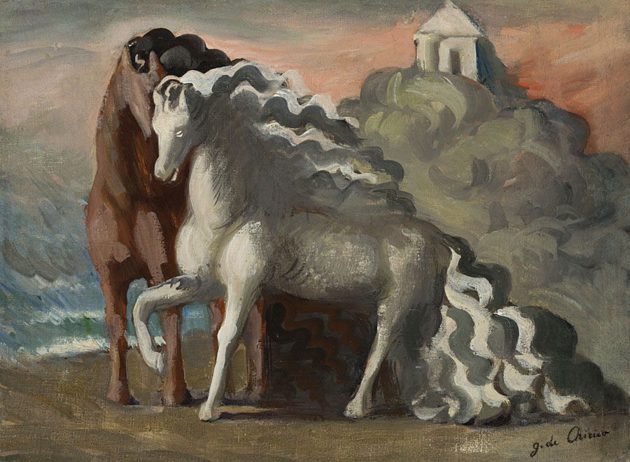Giorgio De Chirico (Volos 1888 - Roma 1978) - "Due cavalli antichi in riva al mare" 1929 ca olio su tela, cm 50,5x69 Firmato in basso a destra Provenienza Galleria dello Scudo, Verona Galleria Cafiso, Milano Collezione privata, Milano Bibliografia C. Bruni Sakraischik "Catalogo Generale di Giorgio De Chirico - Volume Settimo. Opere dal 1908 al 1930" Electa Editrice, Milano 1983, tav. n. 446 ill. Opera accompagnata da certificato di autenticità su fotografia rilasciato da Claudio Bruni Sakraischik in data "Roma, 4 marzo 1980" Opera accompagnata da certificato di autenticità su fotografia rilasciato da Maurizio Fagiolo dell'Arco