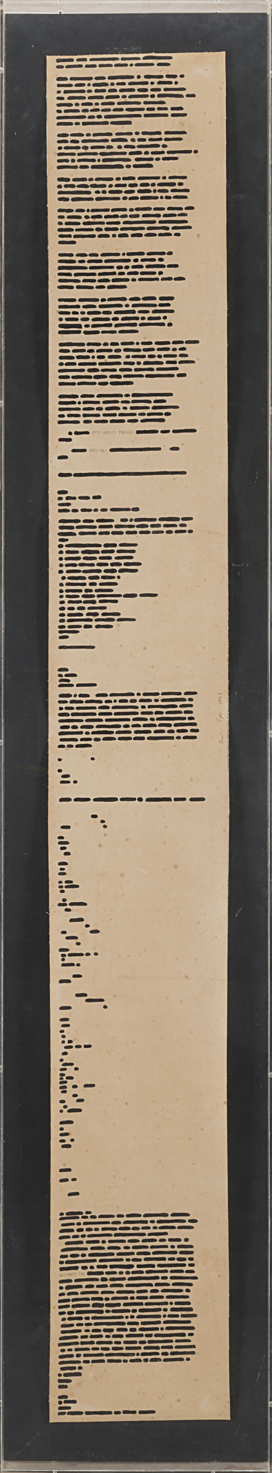 Emilio Isgrò (Barcellona Pozzo di Gotto 1937) - "OTTO UNDICI TREDICI SPECIALI" (Telex) 1973 inchiostro su carta applicata su tavola in teca di plexiglass, cm 170x31,5x6 Firmato e datato 1973 al centro Provenienza Galleria Fonte d'Abisso, Milano Collezione privata, Milano Esposizioni "Emilio Isgrò: cancellature 1965-1987" Istituto Italiano di Cultura, Madrid dicembre 1987 Opera accompagnata da certificato di autenticità su fotografia rilasciato dall'artista in data 29 luglio 2003