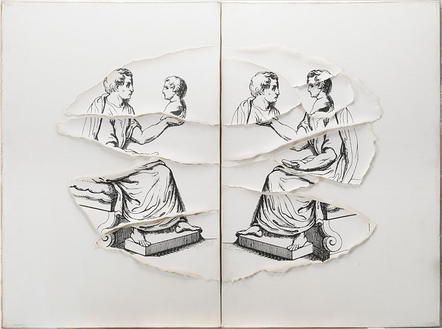 Giulio Paolini (Genova 1940) - "Senza titolo" 1977 collage su tela (in due elementi), cm 60x80 Firmato e datato 1977 al retro Provenienza Studio Marconi, Milano Ivi acquisito dall'attuale proprietario nel 1979 Esposizioni "Protagonisti dell'Arte Italiana 1960-1970" Galleria Pack, Milano 2001 Bibliografia M. Disch "Giulio Paolini. Catalogo Ragionato" Milano 2008, p. 360 n. 349 ill.