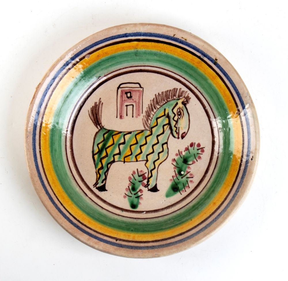 GUNTHER STUDEMANN (Berlino 1890 - 1981) <br>Piatto circolare con decorazione di cavallo a disegni geometrici