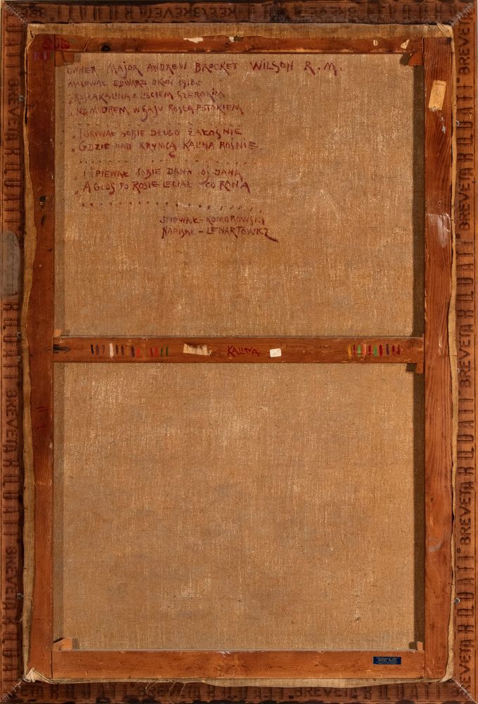 Firmato e datato in basso a destra: Okun, 1918. Firmato e datato al retro con accenno alla strofa della canzone scritta da Teofil Lenartovicz e musicata da Ignacy Komorowski