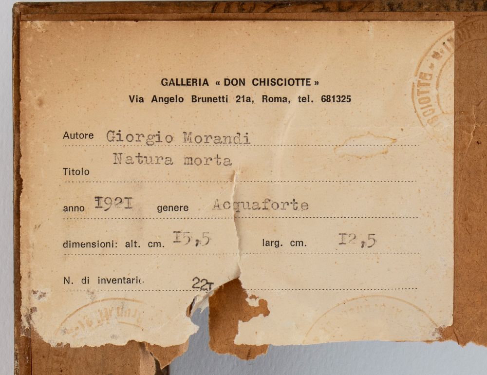 Firmato in alto al centro: Morandi. Al retro etichetta della Galleria Don Chisciotte di Roma