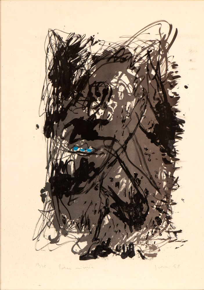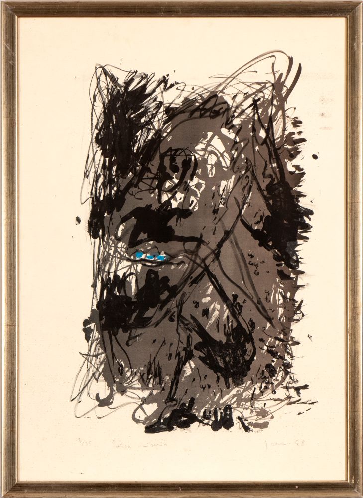 Firmato e datato in basso a destra: Jorn, 58. Tiratura e titolo in basso a sinistra: 13/35, Porca miseria