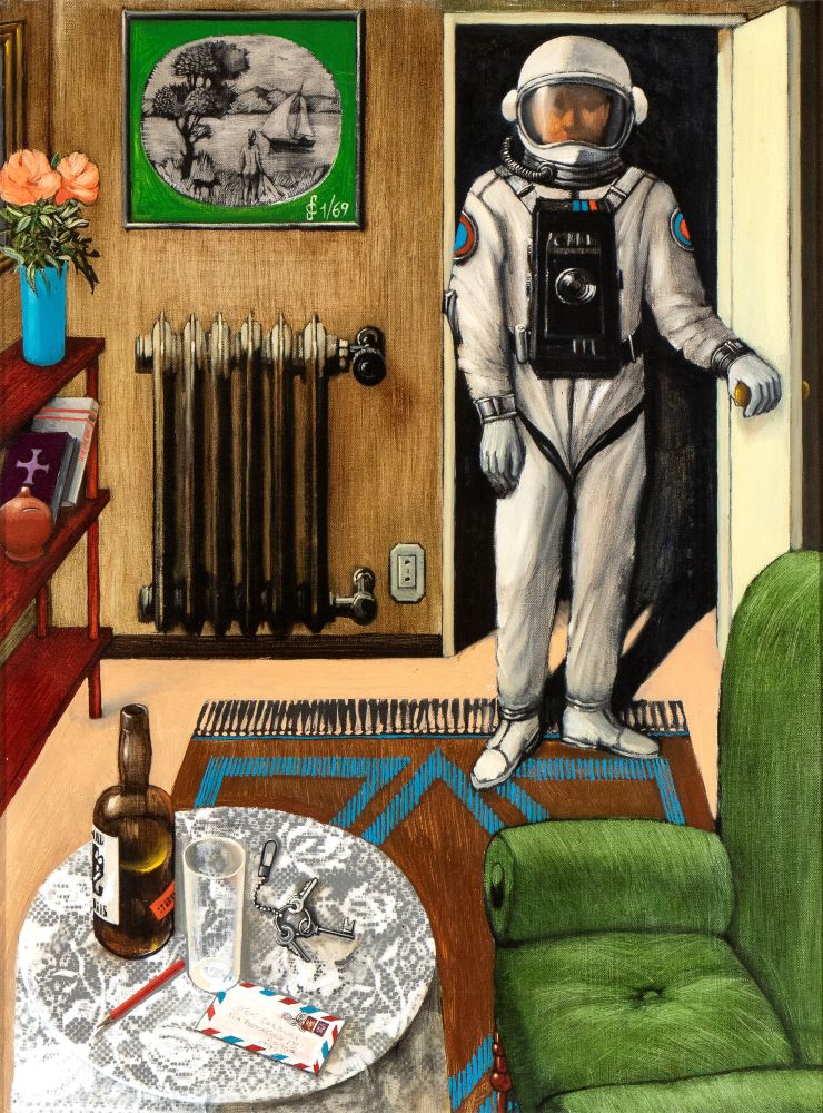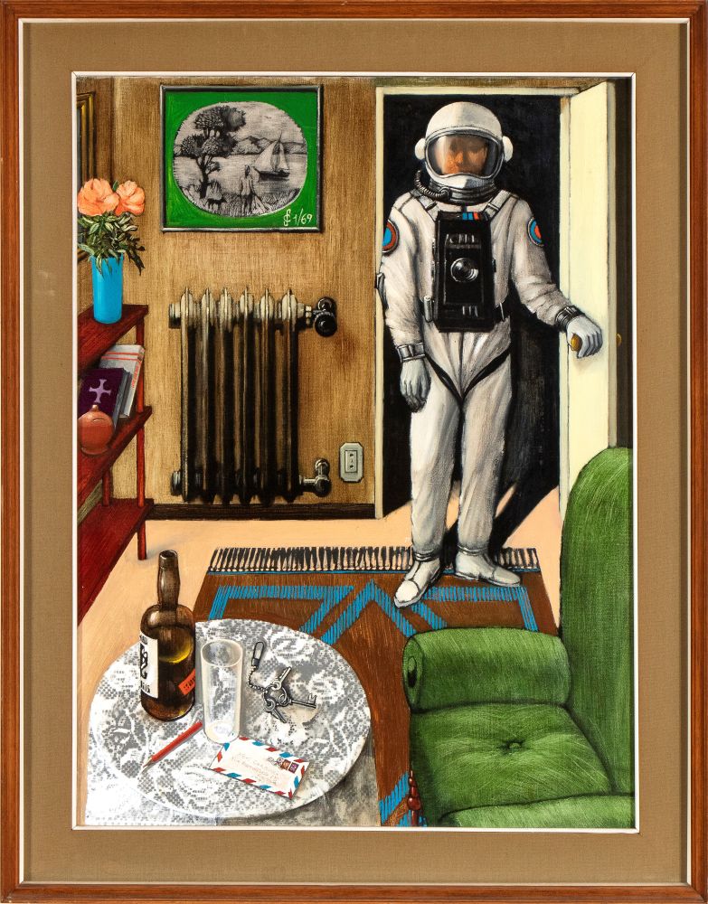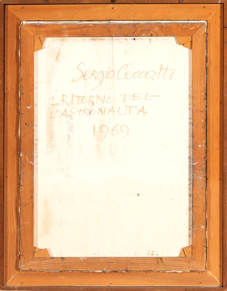 Siglato e datato in alto: SC, 1/69. Firmato, datato e titolato al retro: Sergio Ceccotti, Il ritorno dell'astronauta, 1969.