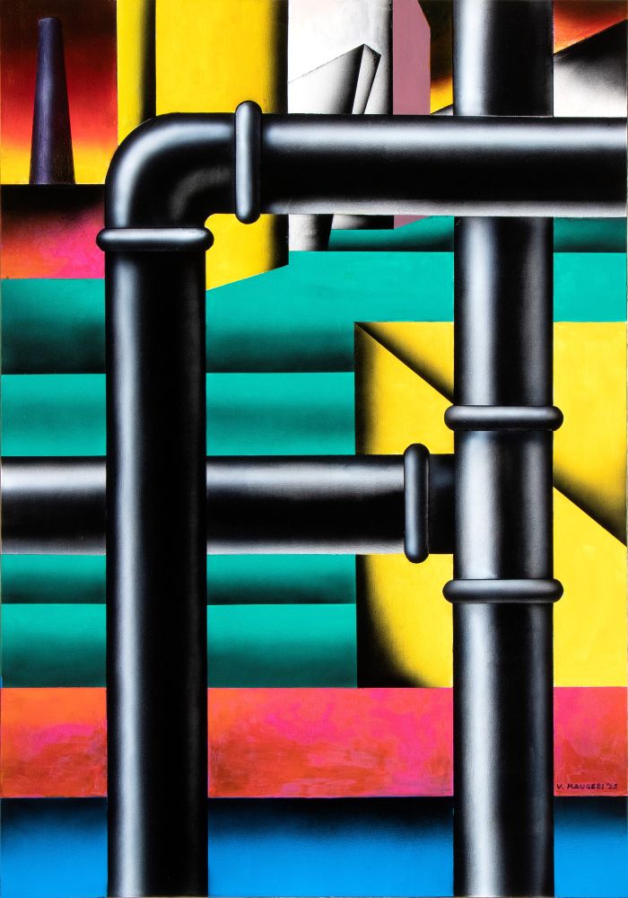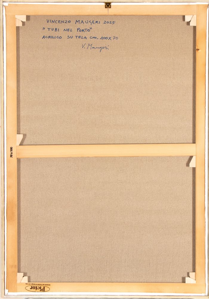 Firmato e datato in basso a destra: V. Maugeri, 25. Firmato e datato al retro: Tubi nel porto, 2025, V. Maugeri