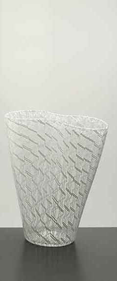 Paolo Venini Vaso in vetro zanfirico lattimo di forma troncoconica lievemente schiacciato 1950 circa, altezza cm 23. Reca vecchia etichetta.