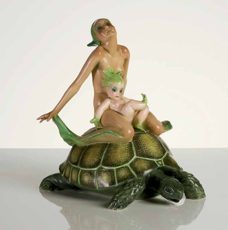 Gruppo raffigurante Sirena, Lenci anni ‘30 Ceramica policroma, altezza cm 31. Firmata: Lenci. Etichetta alla base. Restauri alle dita.