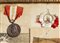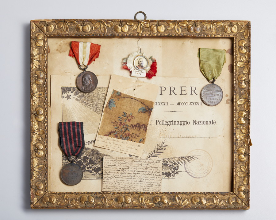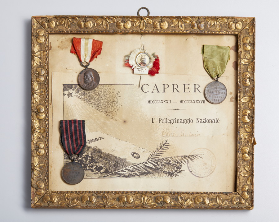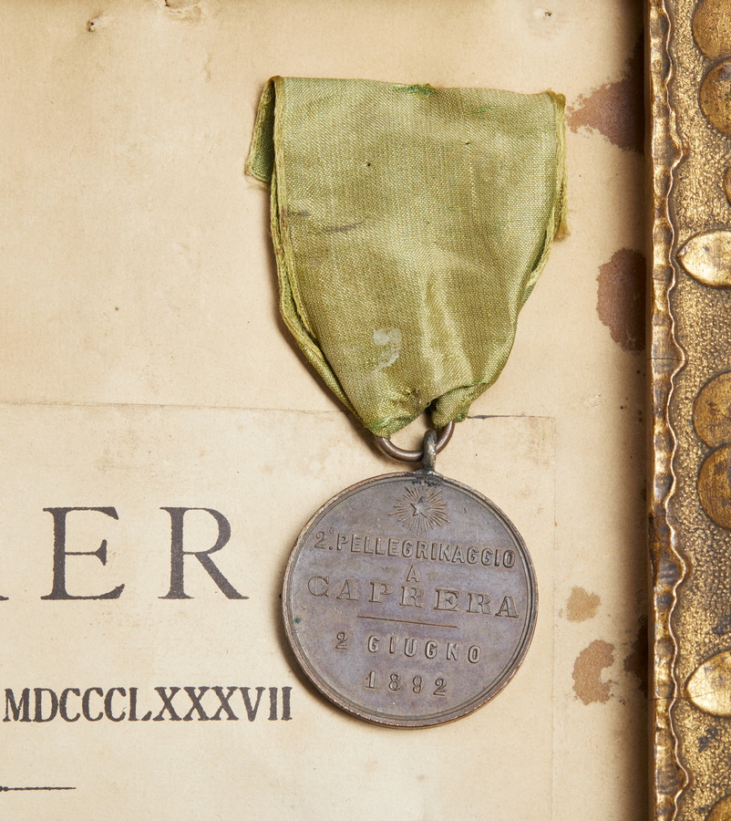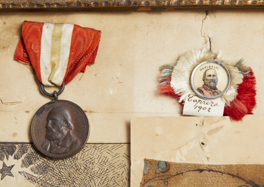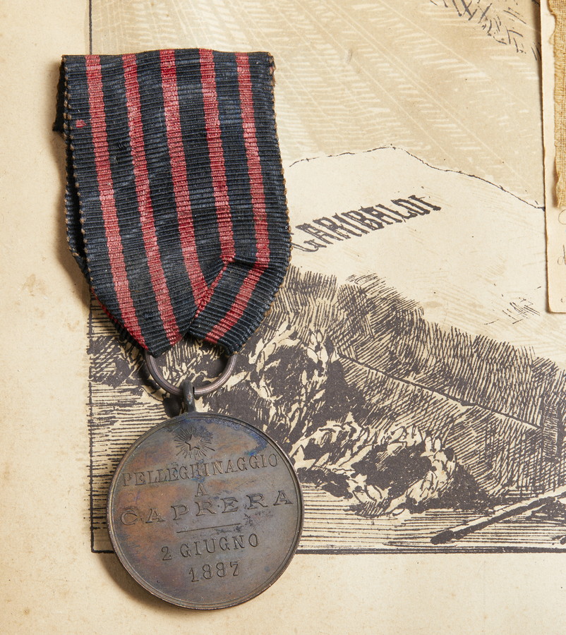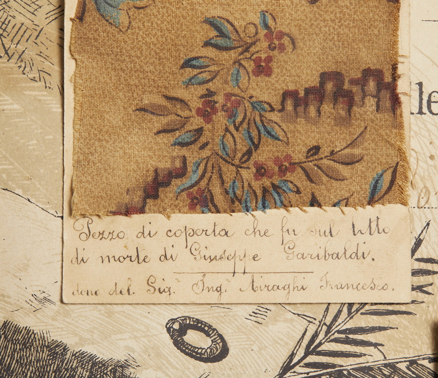 - TRE MEDAGLIE 'GARIBALDI' IN CORNICE DELL'EPOCA ACCOMPAGNATE DA BIGLIETTI DA VISITA MANOSCRITTI E 'PEZZO DI COPERTA CHE FU SUL LETTO DI MORTE DI GARIBALDI.