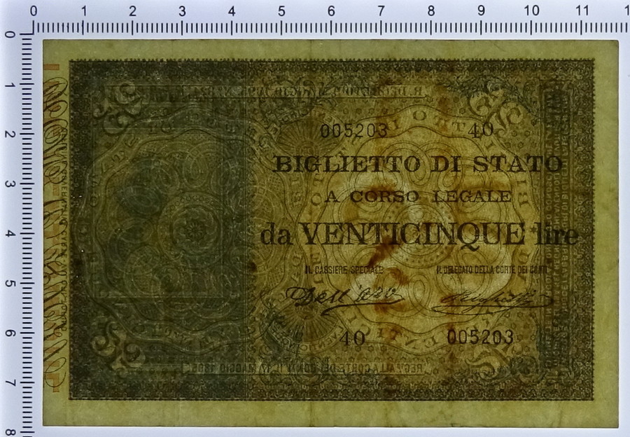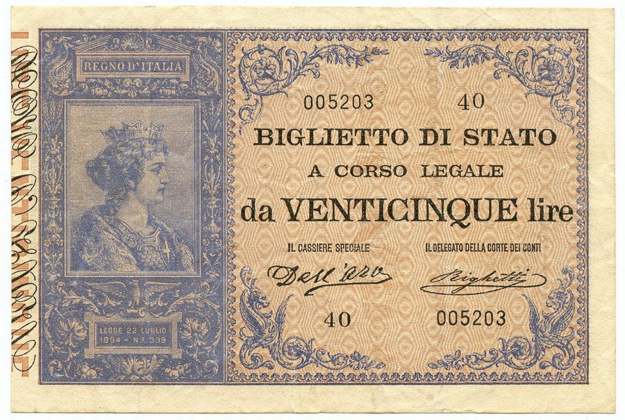 25 LIRE BIGLIETTO DI STATO REGNO UMBERTO I ITALIA TURRITA 21/07/1895 BB/SPL. . . NUMERO DI SERIE: 40 005203