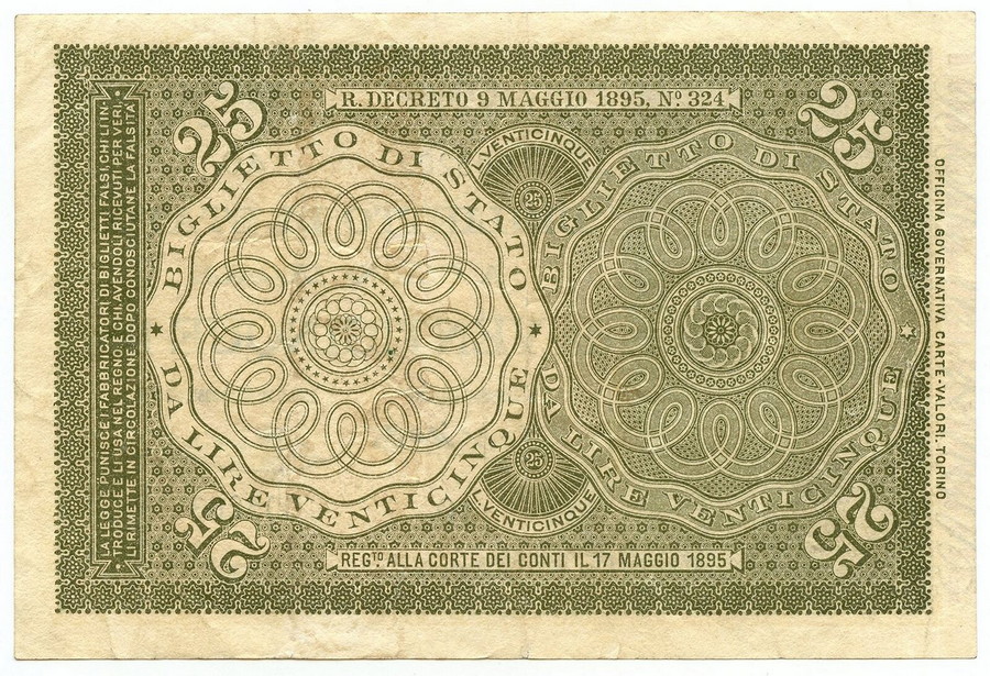 - 25 LIRE BIGLIETTO DI STATO REGNO UMBERTO I ITALIA TURRITA 21/07/1895 BB/SPL.