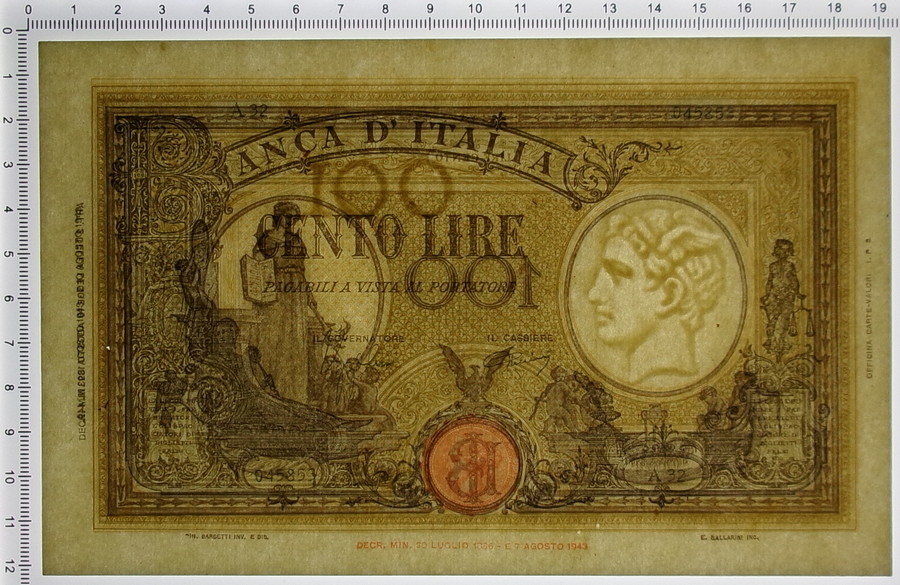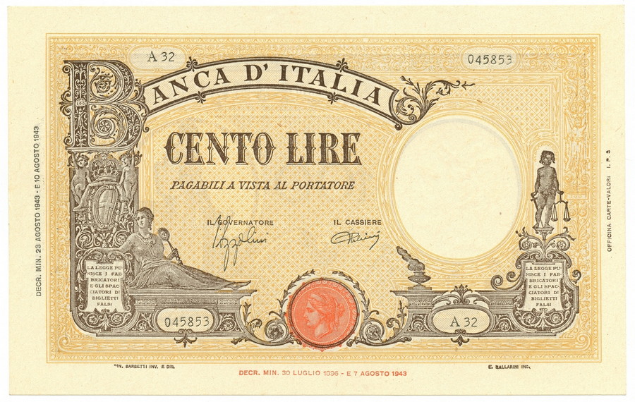 100 LIRE BARBETTI GRANDE B GIALLO TESTINA BI 23/08/1943 SUP. . . BIGLIETTO NON CIRCOLATO